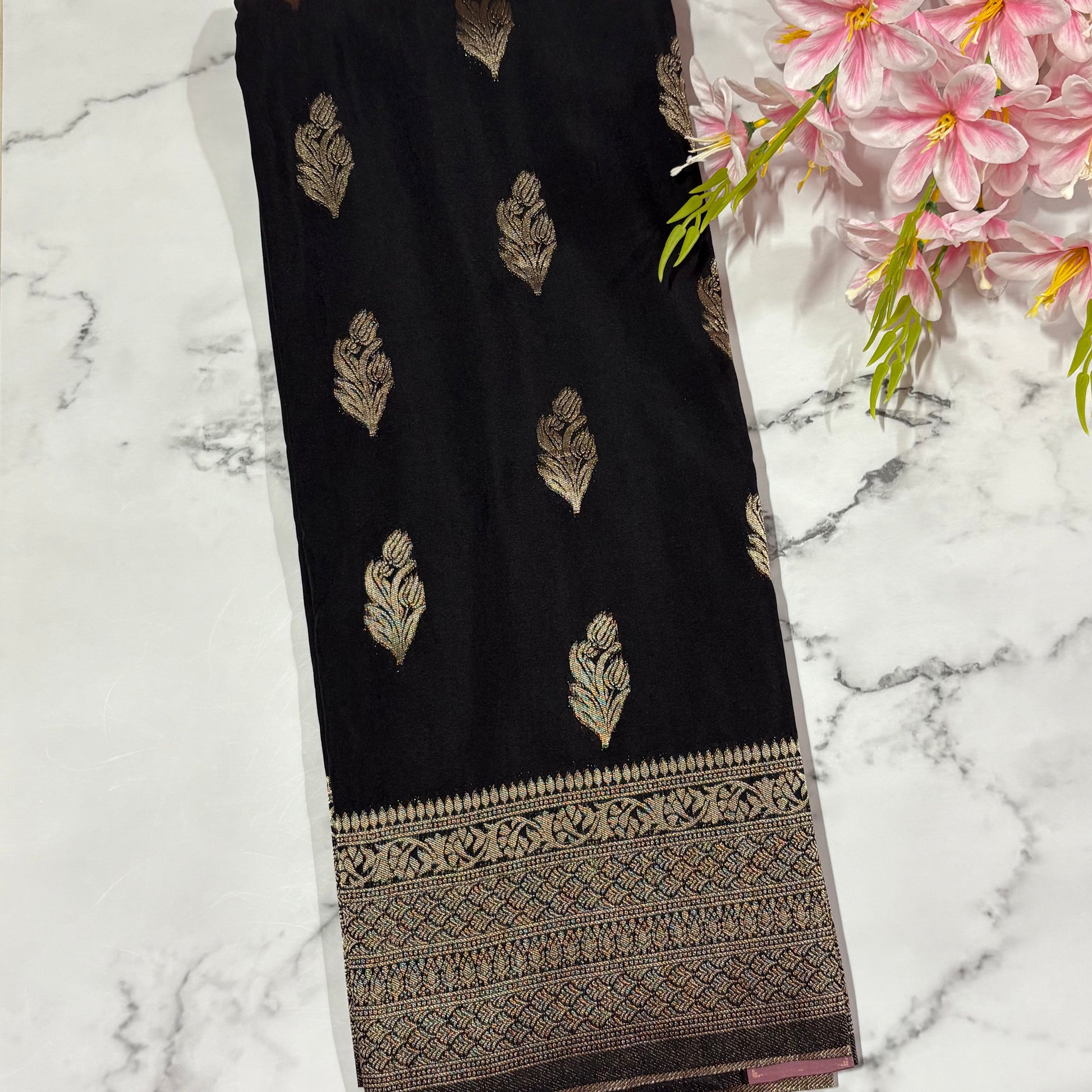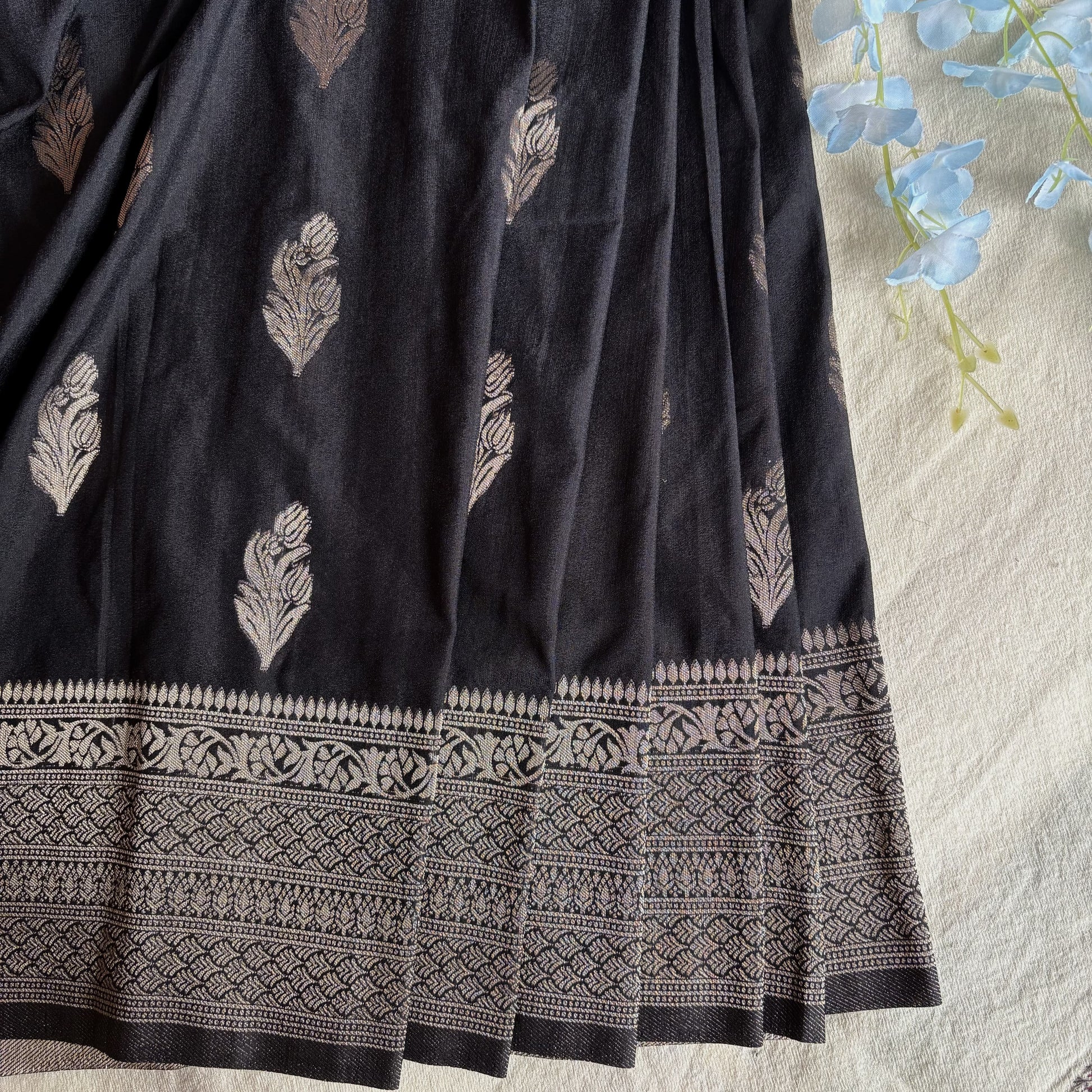 A timeless black semi matka silk saree adorned with subtle antique zari buttas and a finely woven border. The lightly textured fabric gives it a classic, elegant drape — perfect for family functions, festive occasions, or temple visits.