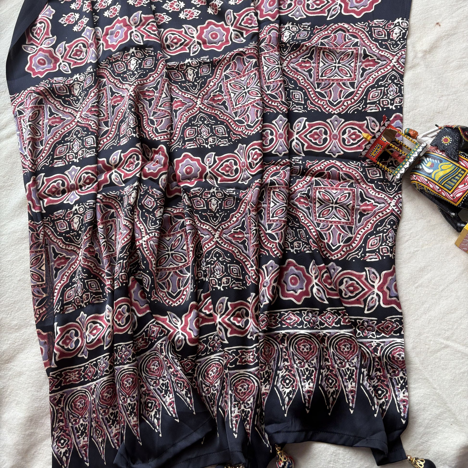 A graceful Satin Crepe Saree featuring delicate Ajrakh-inspired floral motifs in warm rust and ivory tones on a deep black base. The smooth, flowy satin crepe fabric drapes beautifully, making it ideal for festive gatherings, casual outings, or cultural celebrations. A perfect harmony of elegance and heritage charm.