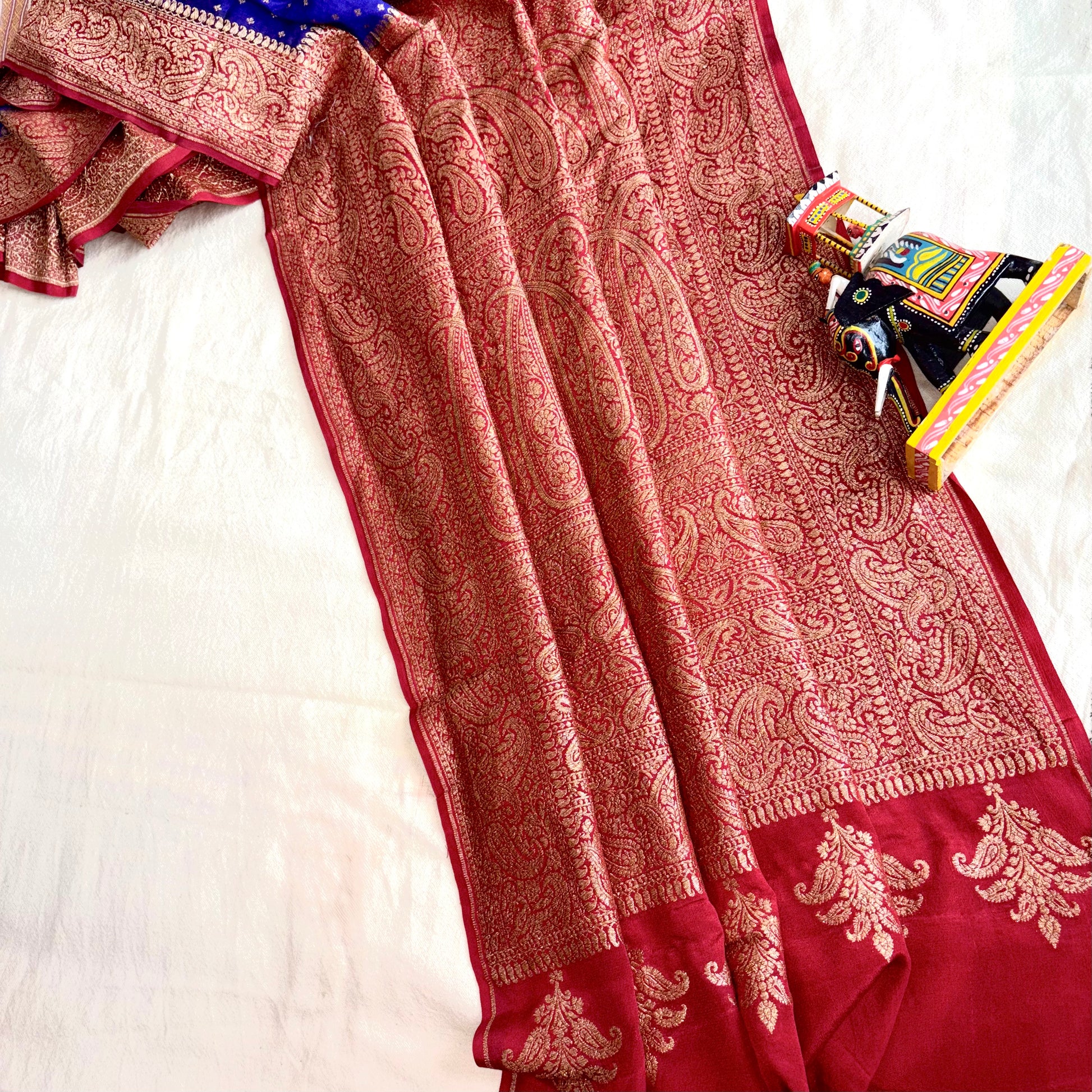 A rich Blue Banarasi Pure Crepe Saree, featuring delicate gold zari buttas and a classic red paisley woven border. Lightweight, flowy, and timeless — perfect for festivals, temple visits, and special occasions.