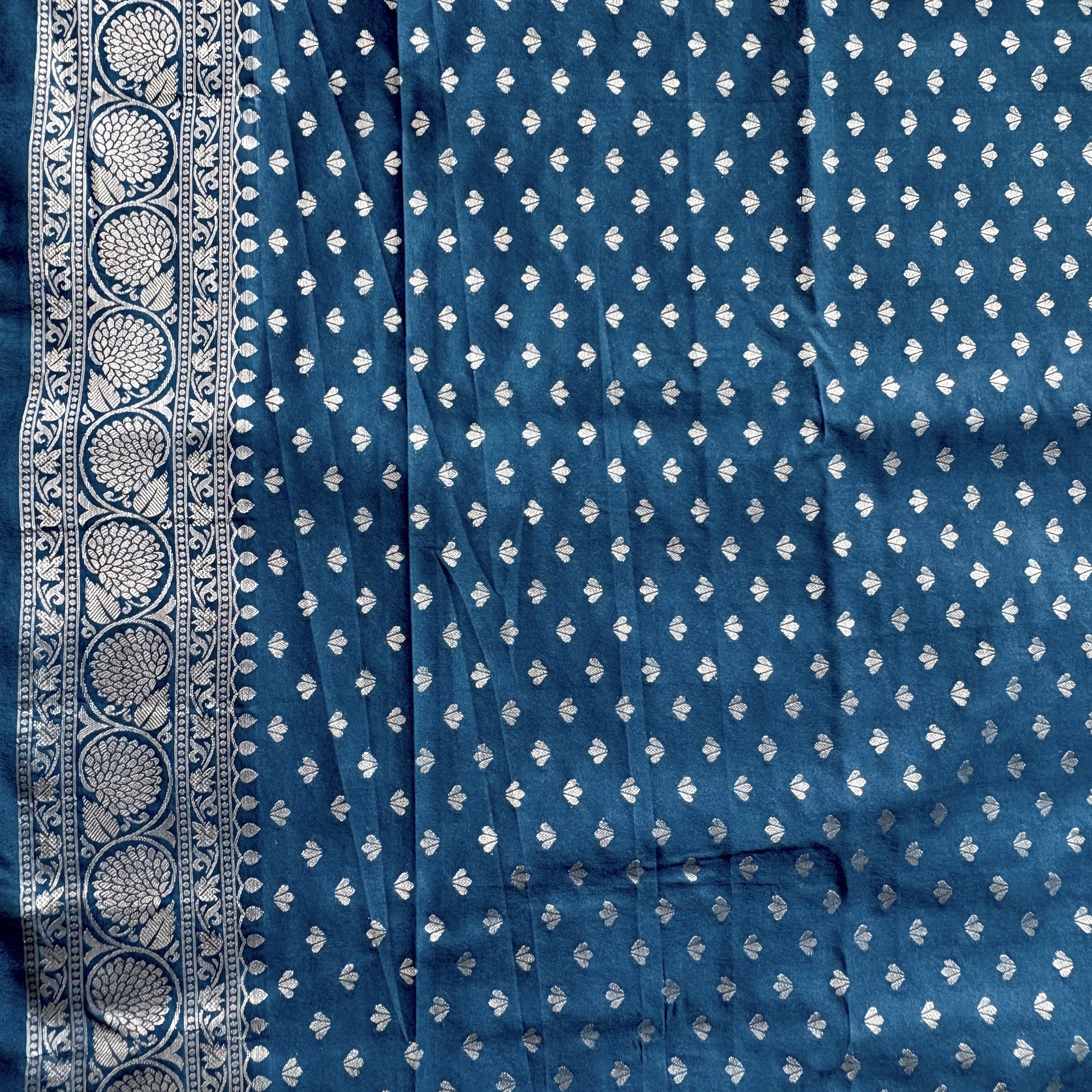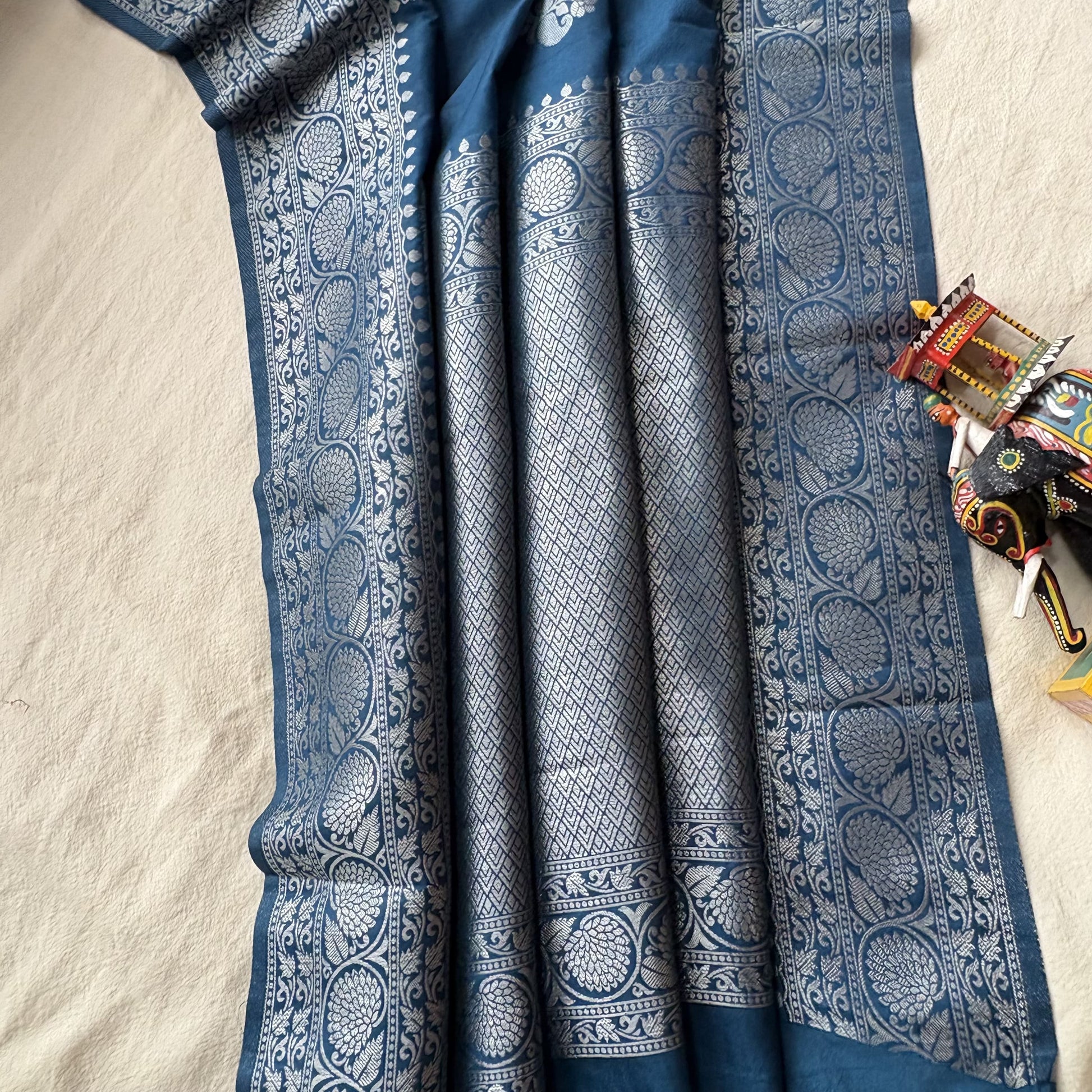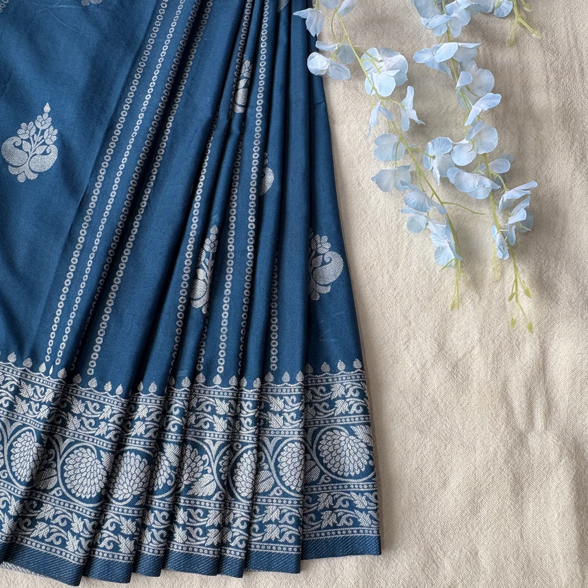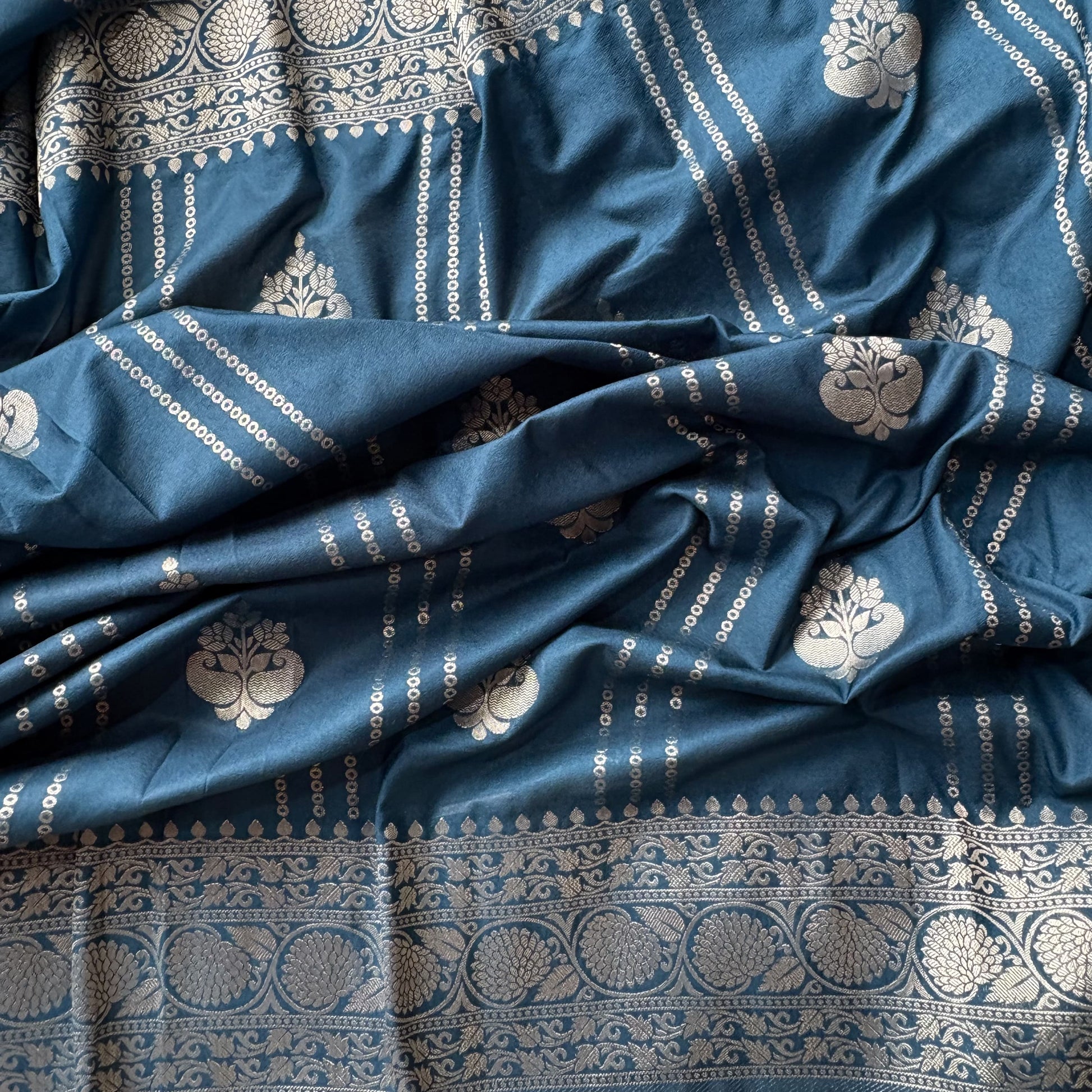 A rich traditional look blue saree with silver zari woven all over. It comes with a detailed floral border, all over zari stripes with big buttas and a grand pallu, making it perfect for festivals, or any special occasion.
