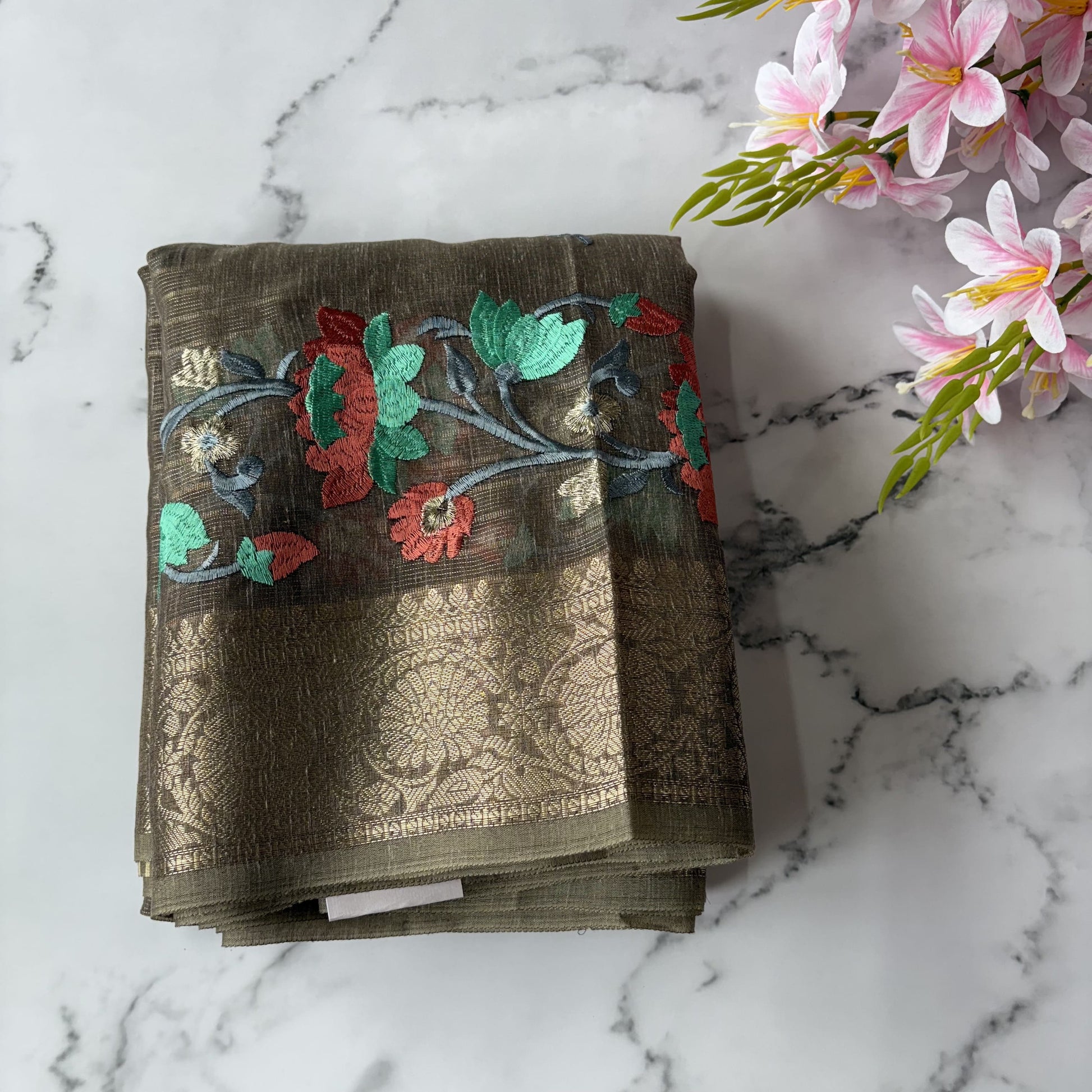 A lovely Brownish Grey Kora Cotton Silk Saree with floral work. This saree is a pretty grey with a light checked pattern. It has beautiful flower embroidery on the border and end, in orange, grey, and green colors. A traditional silver border adds to its beauty. This is a great choice for parties and special events.