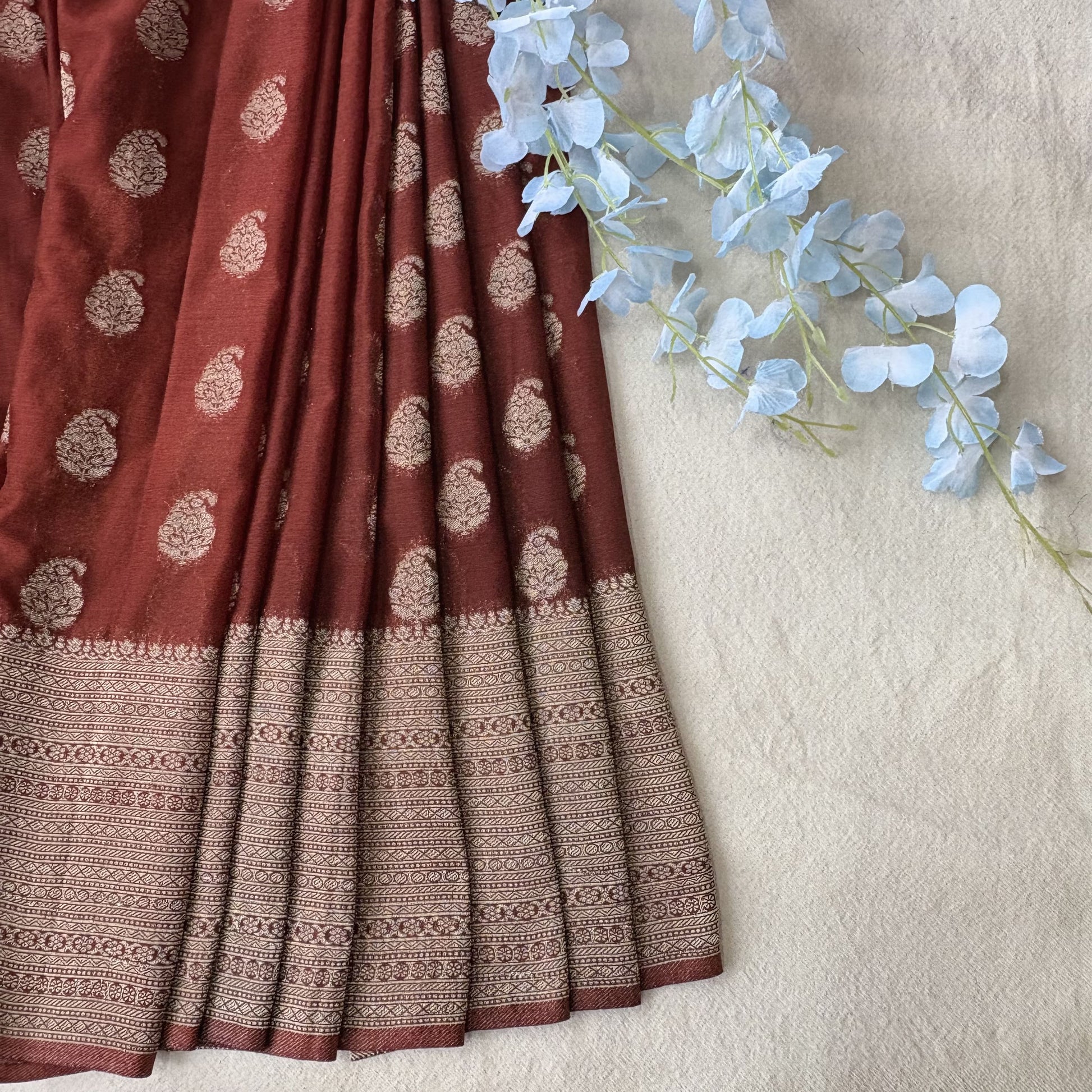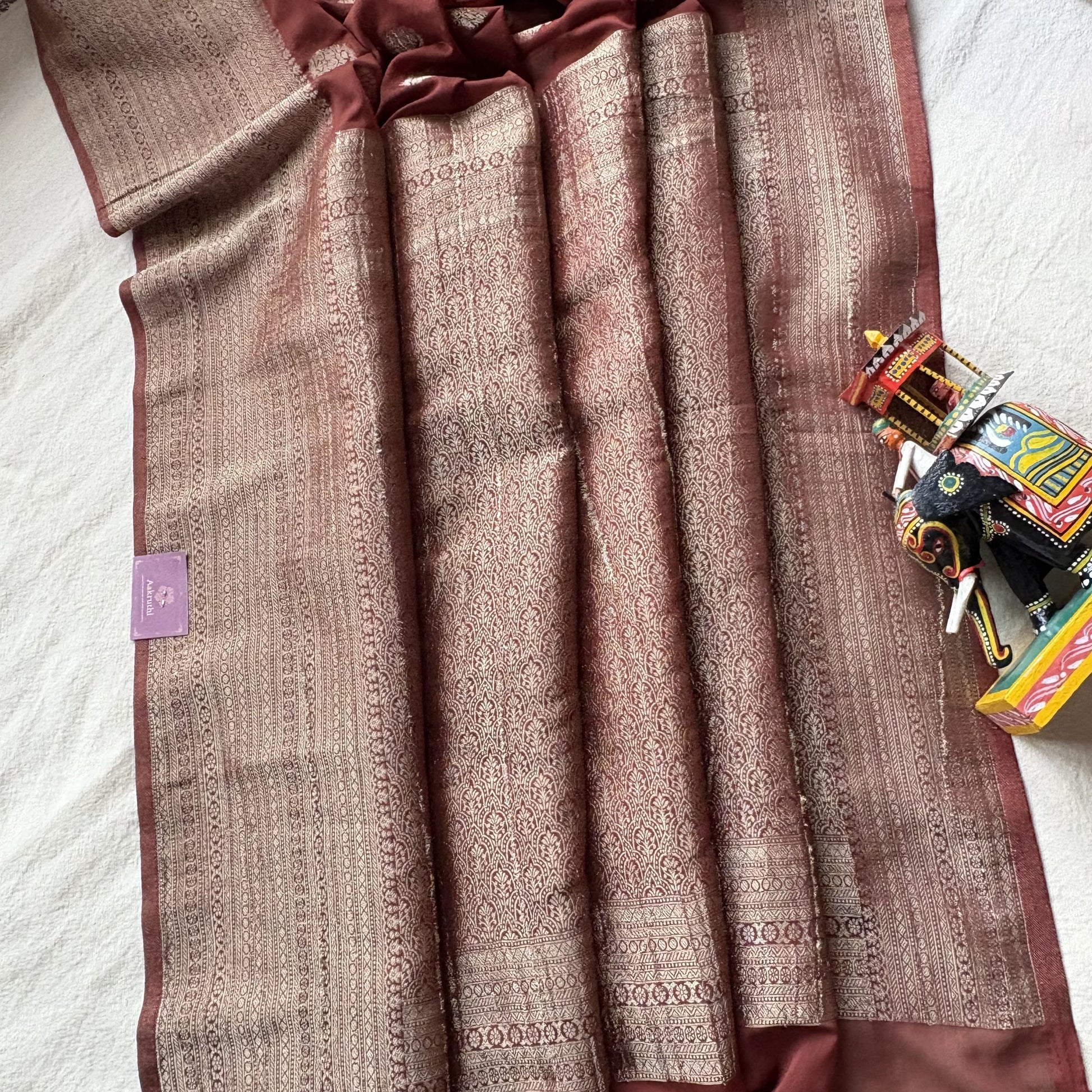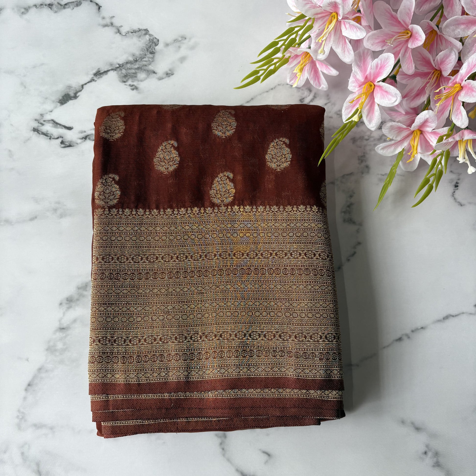 A sophisticated Brown Semi Georgette Banarasi Saree featuring intricate woven designs. The smooth and lightweight fabric drapes beautifully, making it an elegant choice for special occasions. The body of the saree has an all-over woven mango motif, while the borders and pallu are adorned with intricate patterns, adding a touch of timeless charm.