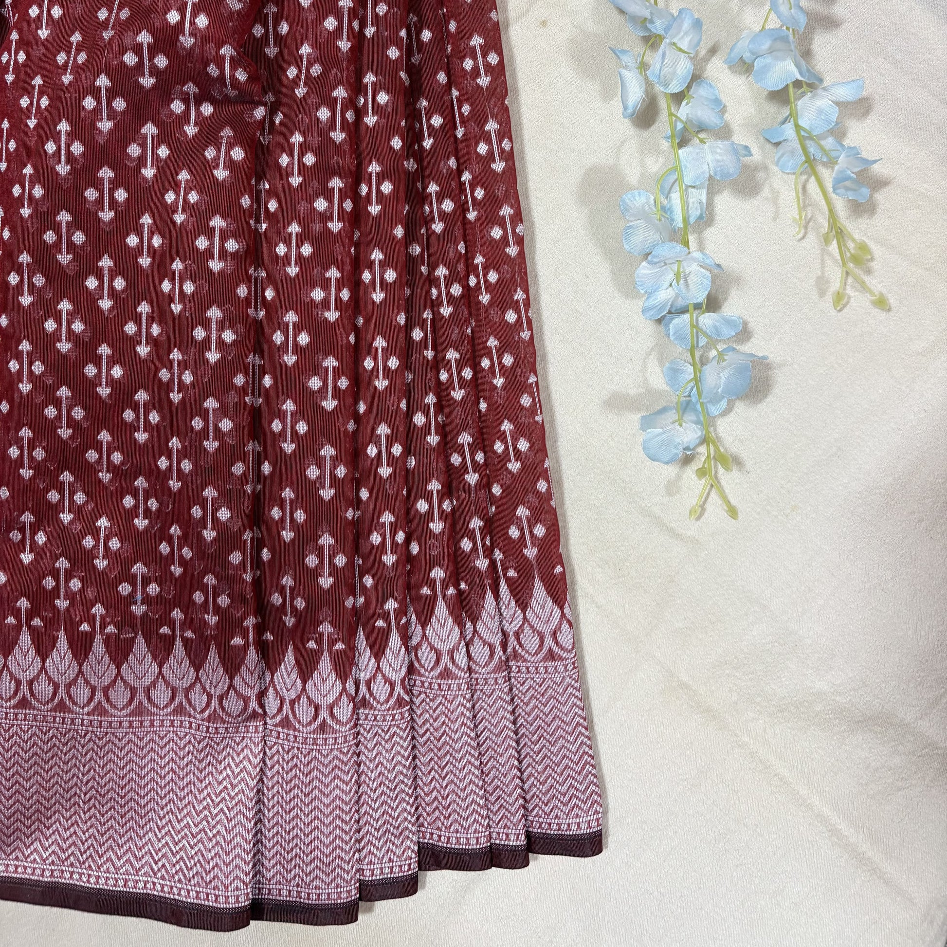 Effortlessly elegant, this brown colour woven cotton saree features delicate white thread motifs all over and a finely detailed border. The breathable cotton fabric and soft texture make it a perfect pick for casual outings, office wear, or daily poojas — where comfort meets classic charm.