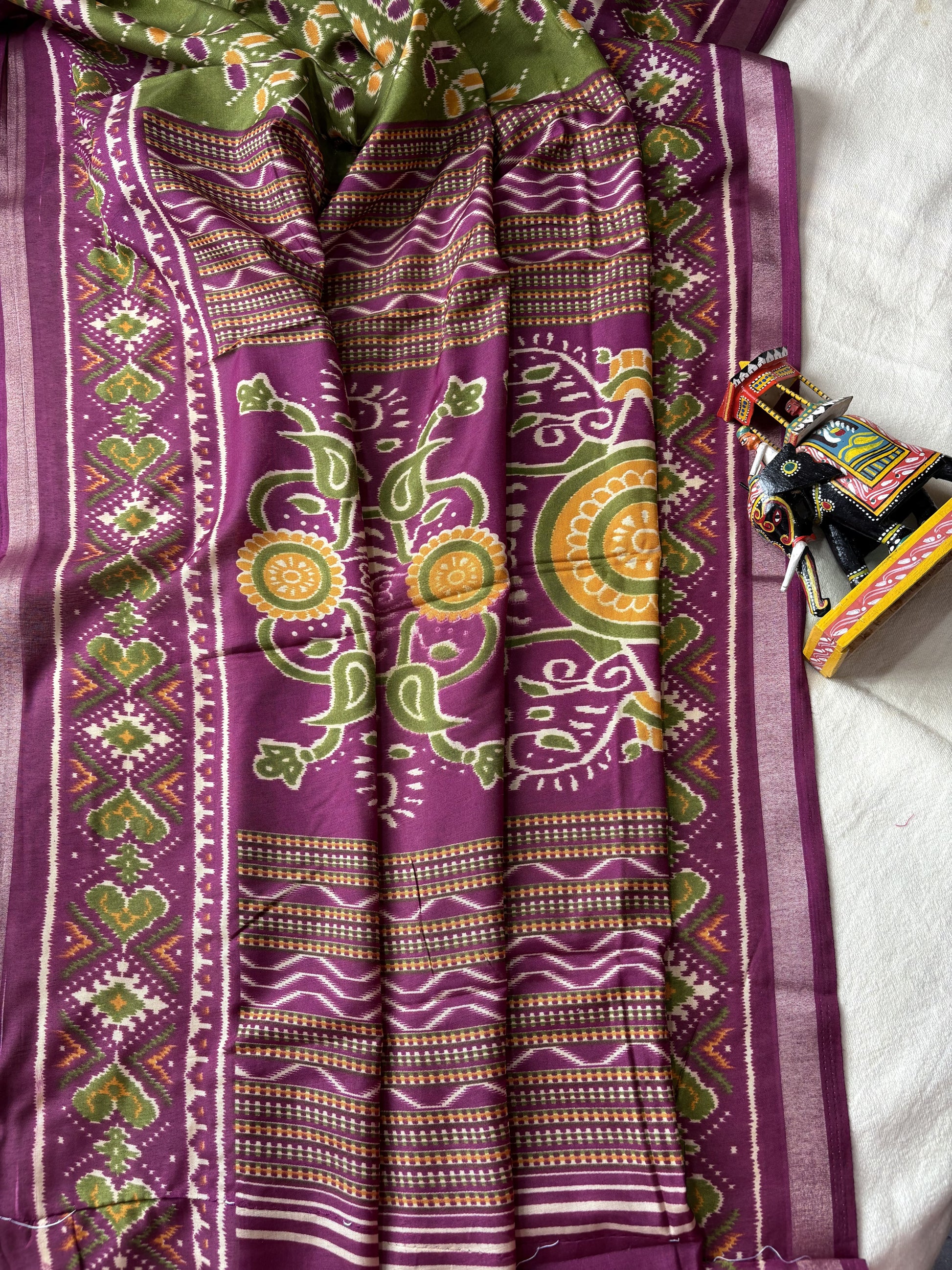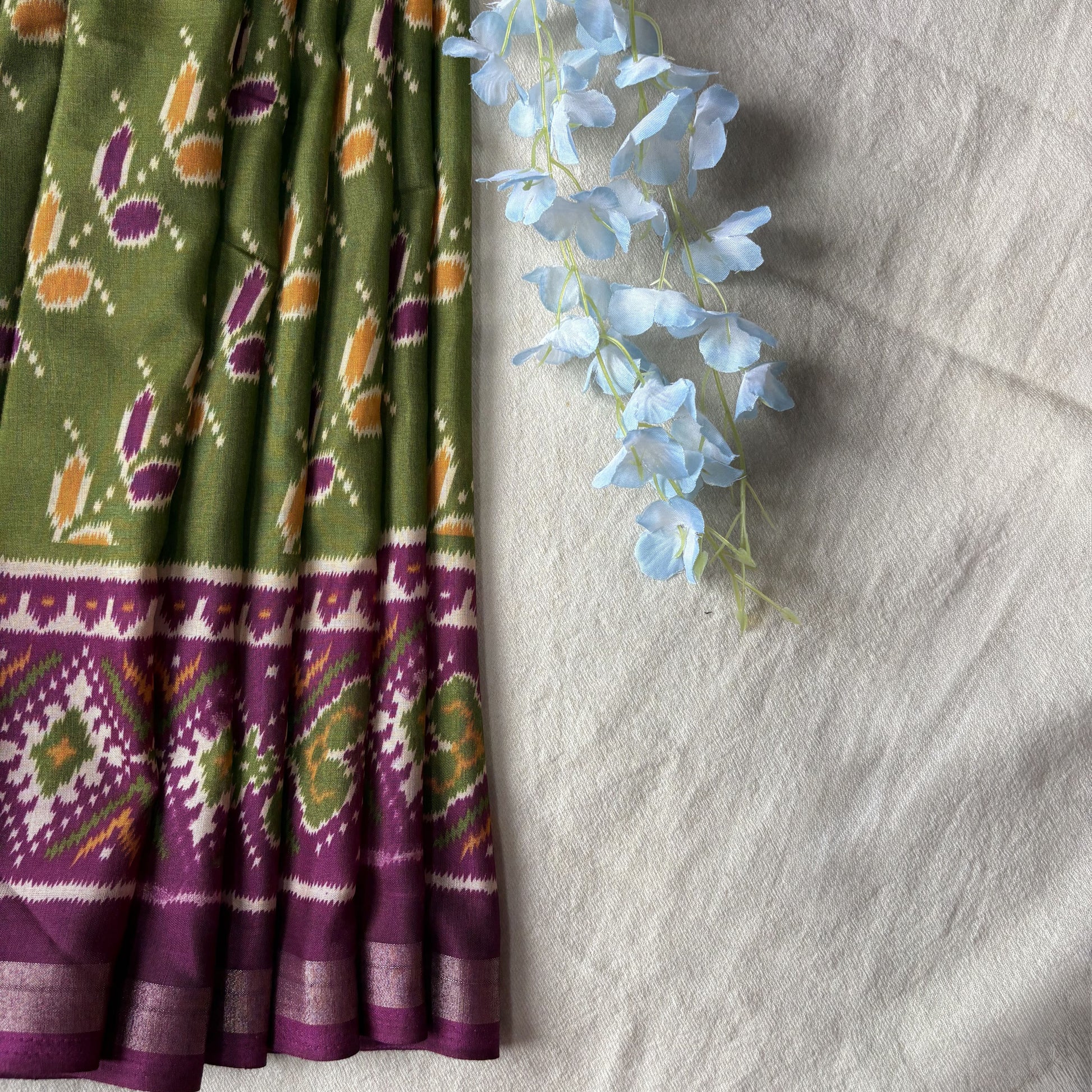 A beautiful Green Printed Soft Chanderi Cotton Saree features elegant pochampally prints all over with a charming floral border. The pallu stands out with detailed patterns. Light, flowy, and easy to carry — perfect for festive mornings or casual gatherings.