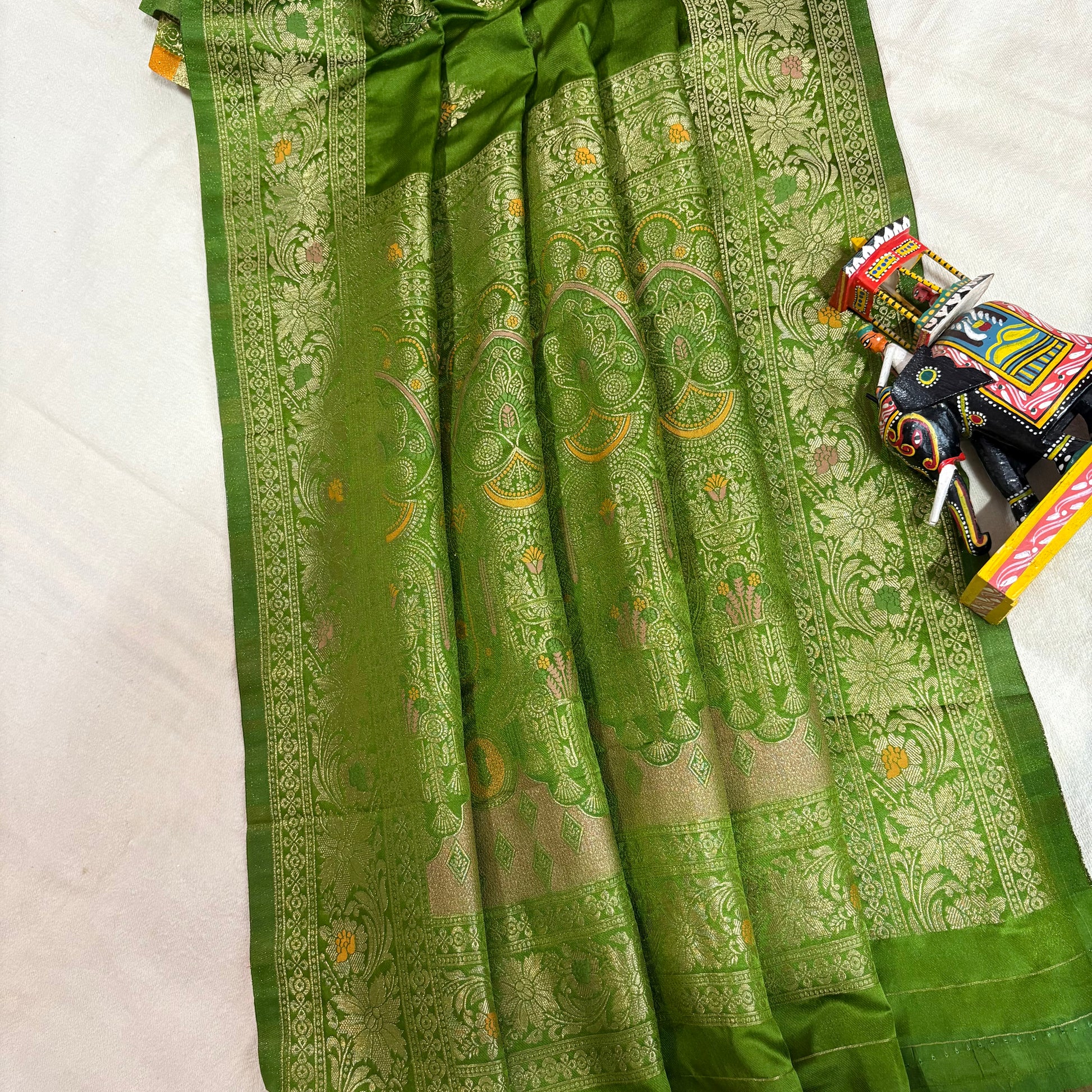 Elegant and eye-catching Green Semi Mashroo Banarasi saree has a smooth, satin-like texture with a soft sheen with intricate gold buttas, and a rich floral zari border — perfect for festive occasions and family functions.
