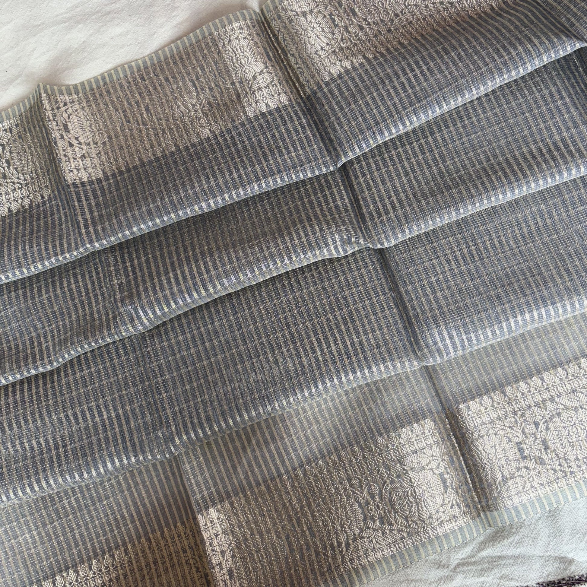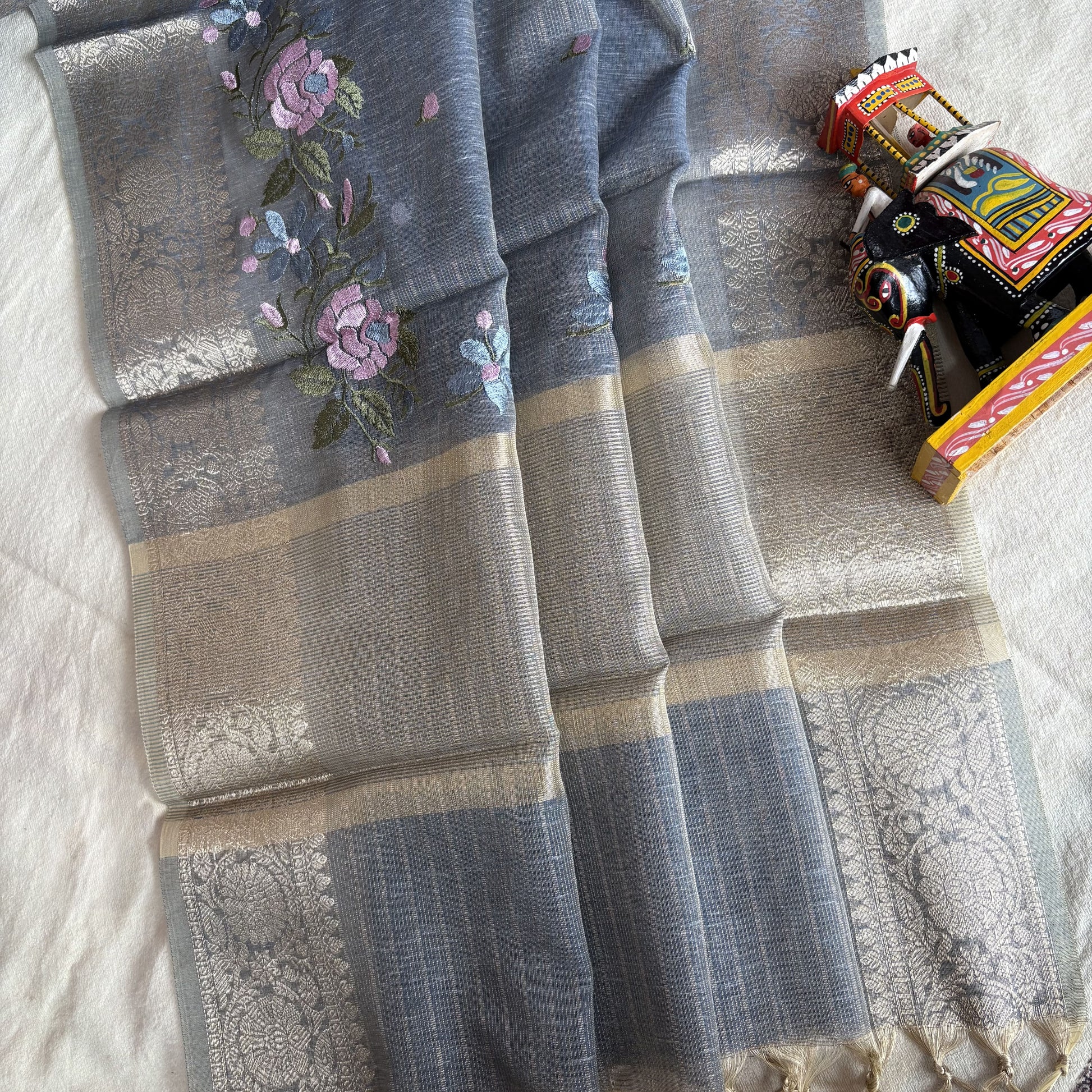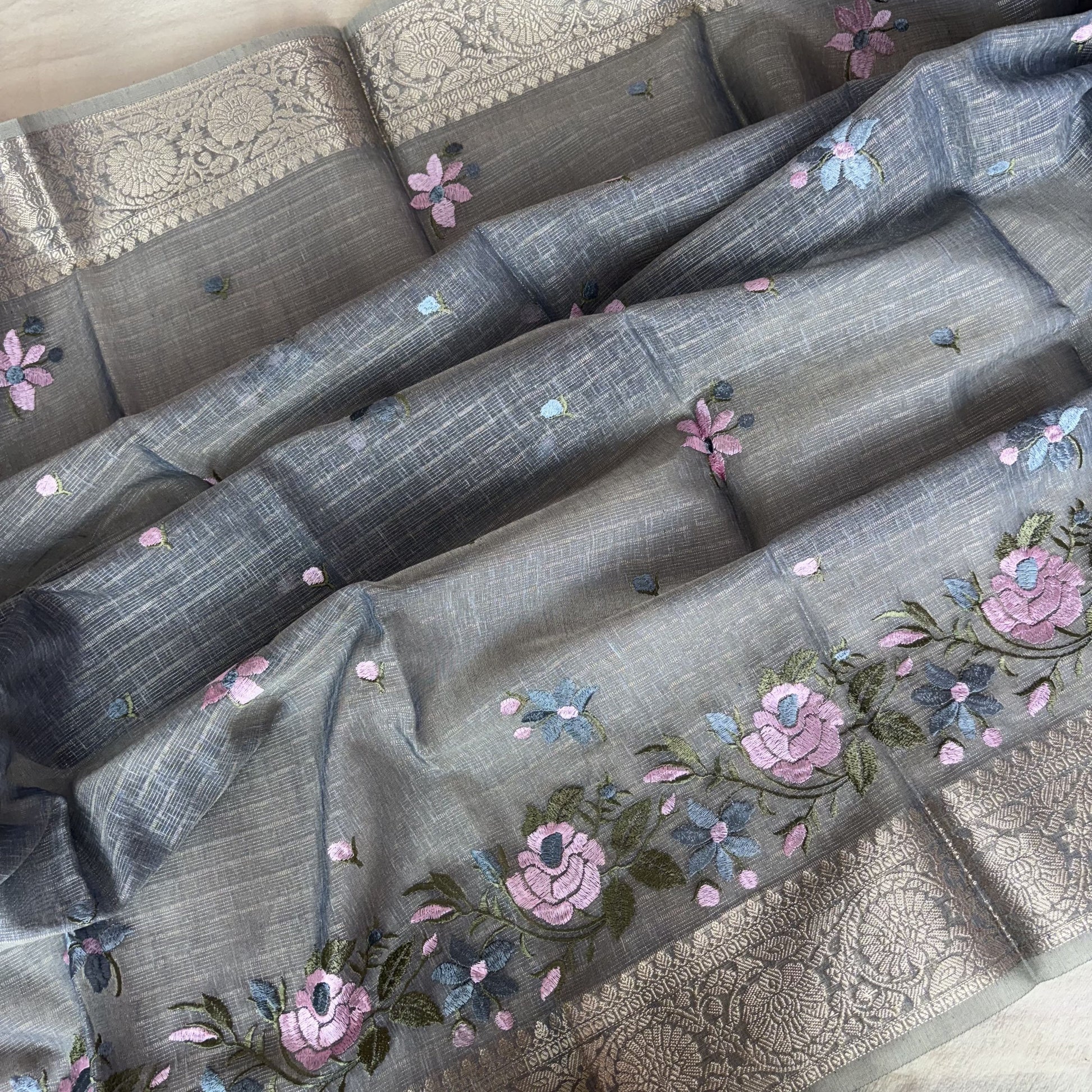 A lovely Grey Kora Cotton Silk Saree with floral work. This saree is a pretty grey with a light checked pattern. It has beautiful flower embroidery on the border and end, in soft pink, blue, and green colors. A traditional silver border adds to its beauty. This is a great choice for parties and special events.