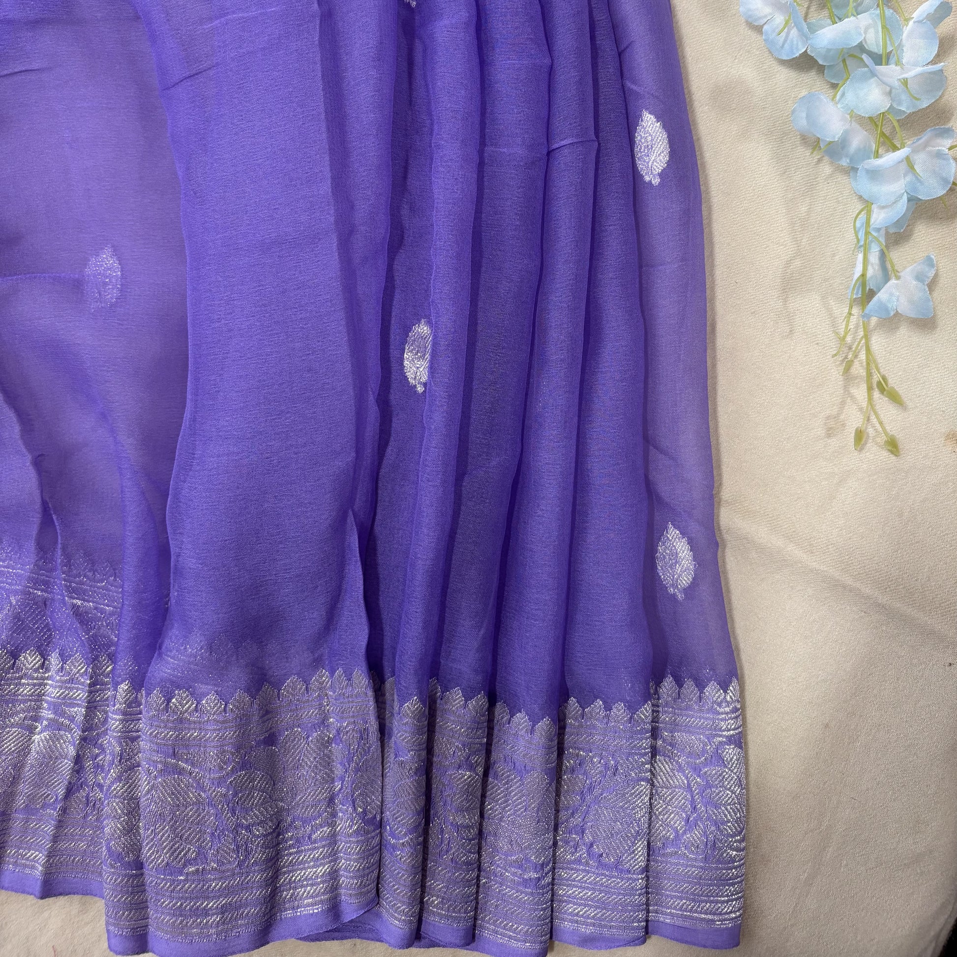 An elegant Lavender Pure Khaddi Chiffon Banarasi saree with intricate silver zari floral woven border and allover buttas. Light, airy, and graceful, it’s perfect for festivals, temple visits, weddings, and family gatherings, blending tradition with subtle sophistication.
