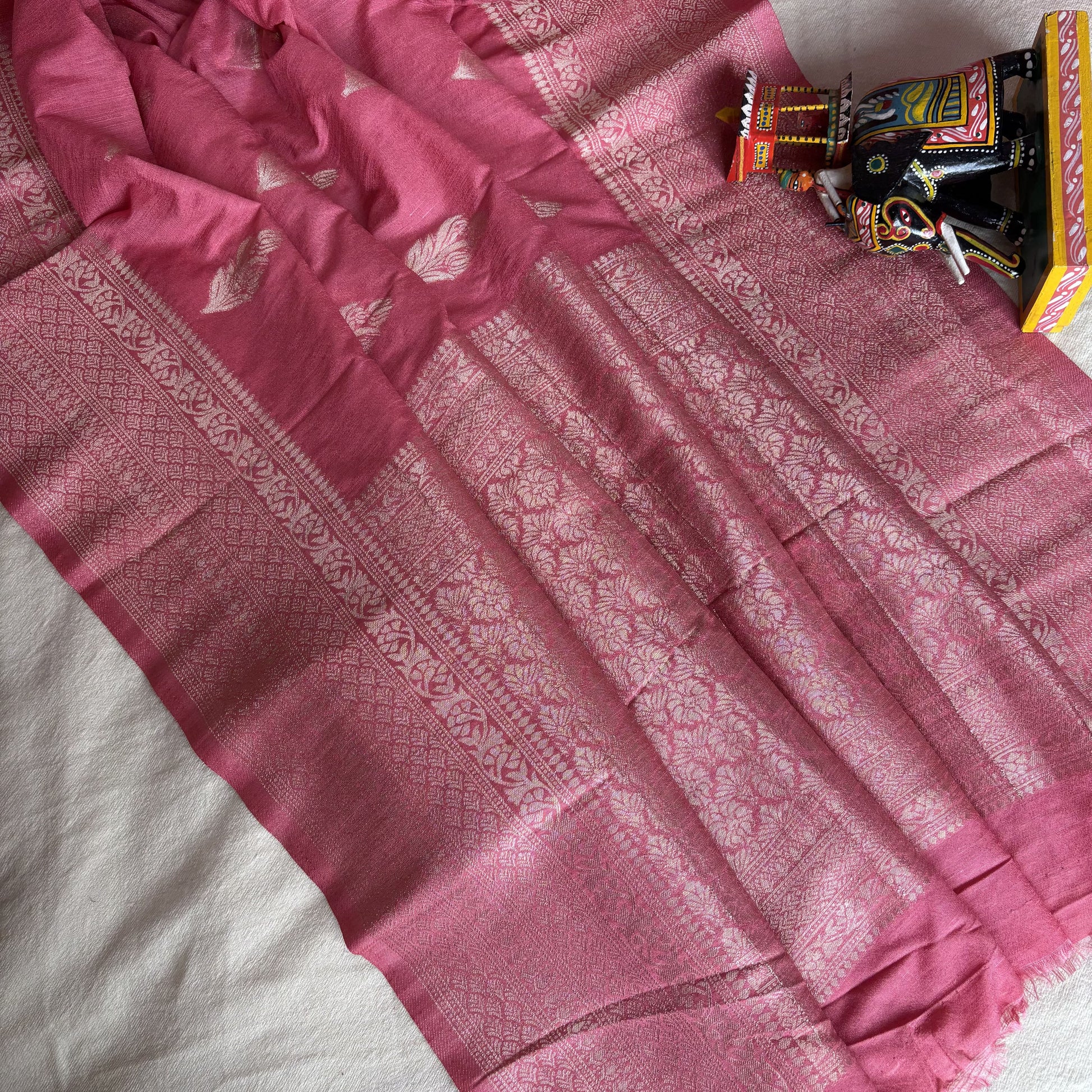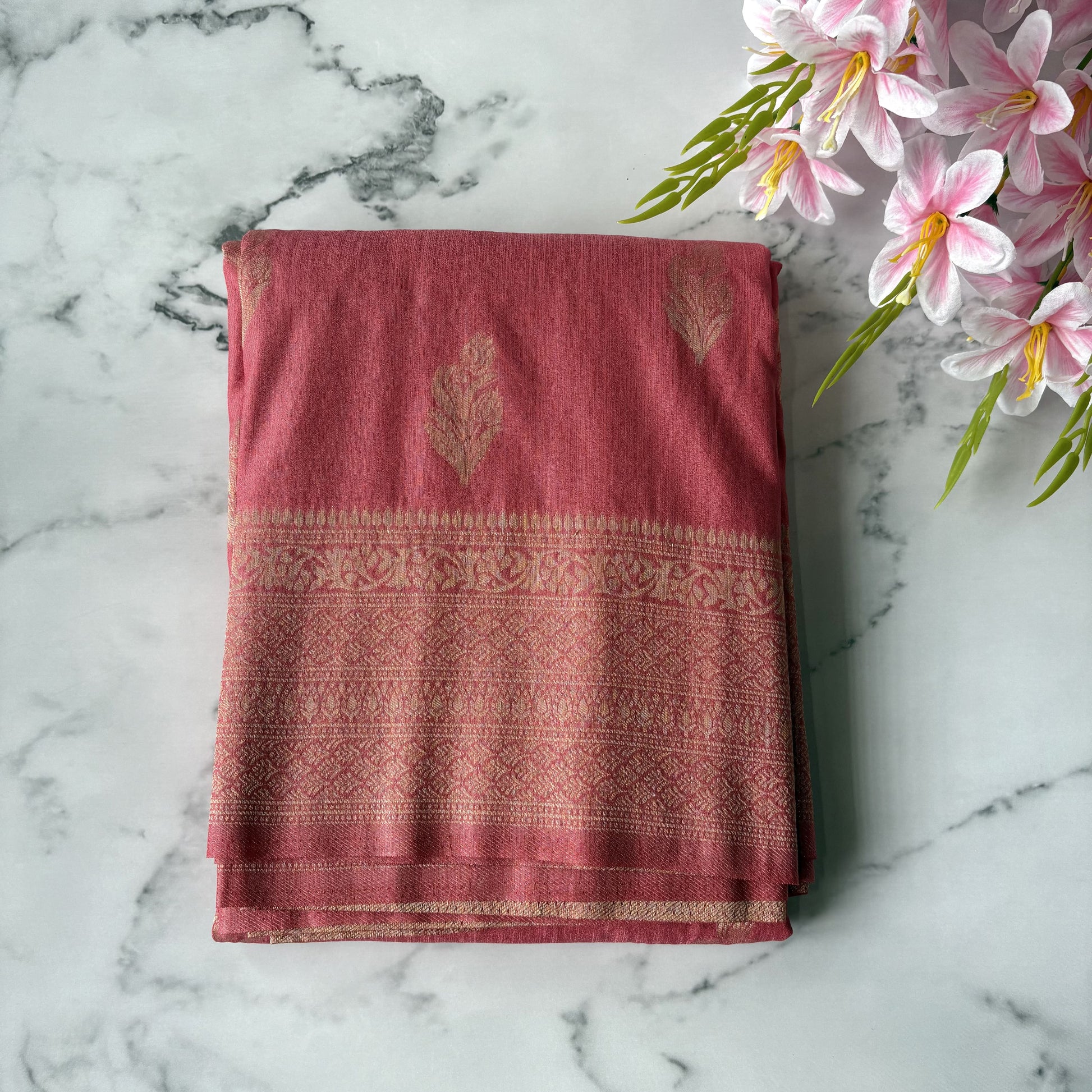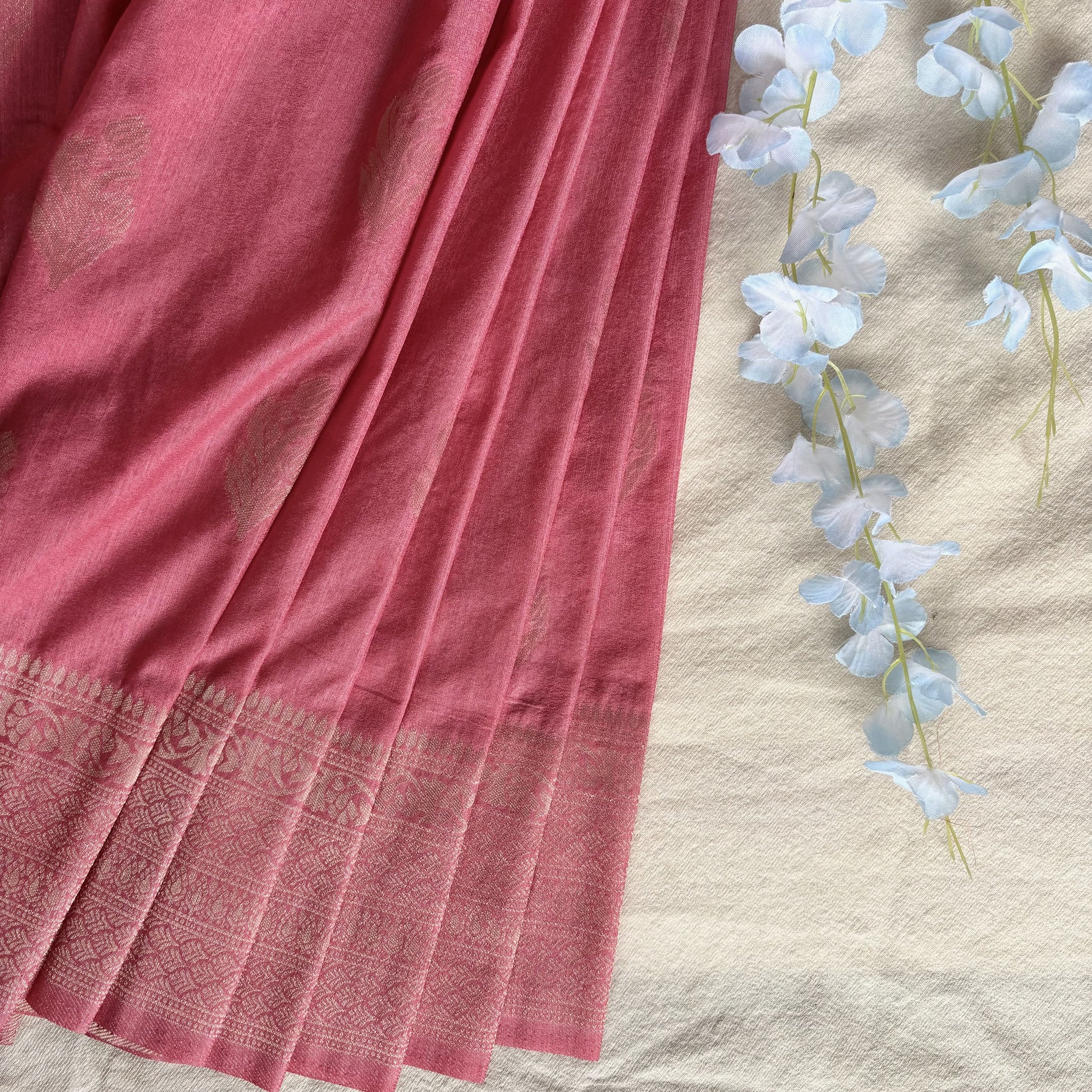 A timeless pastel pink semi matka silk saree adorned with subtle antique zari buttas and a finely woven border. The lightly textured fabric gives it a classic, elegant drape — perfect for family functions, festive occasions, or temple visits.