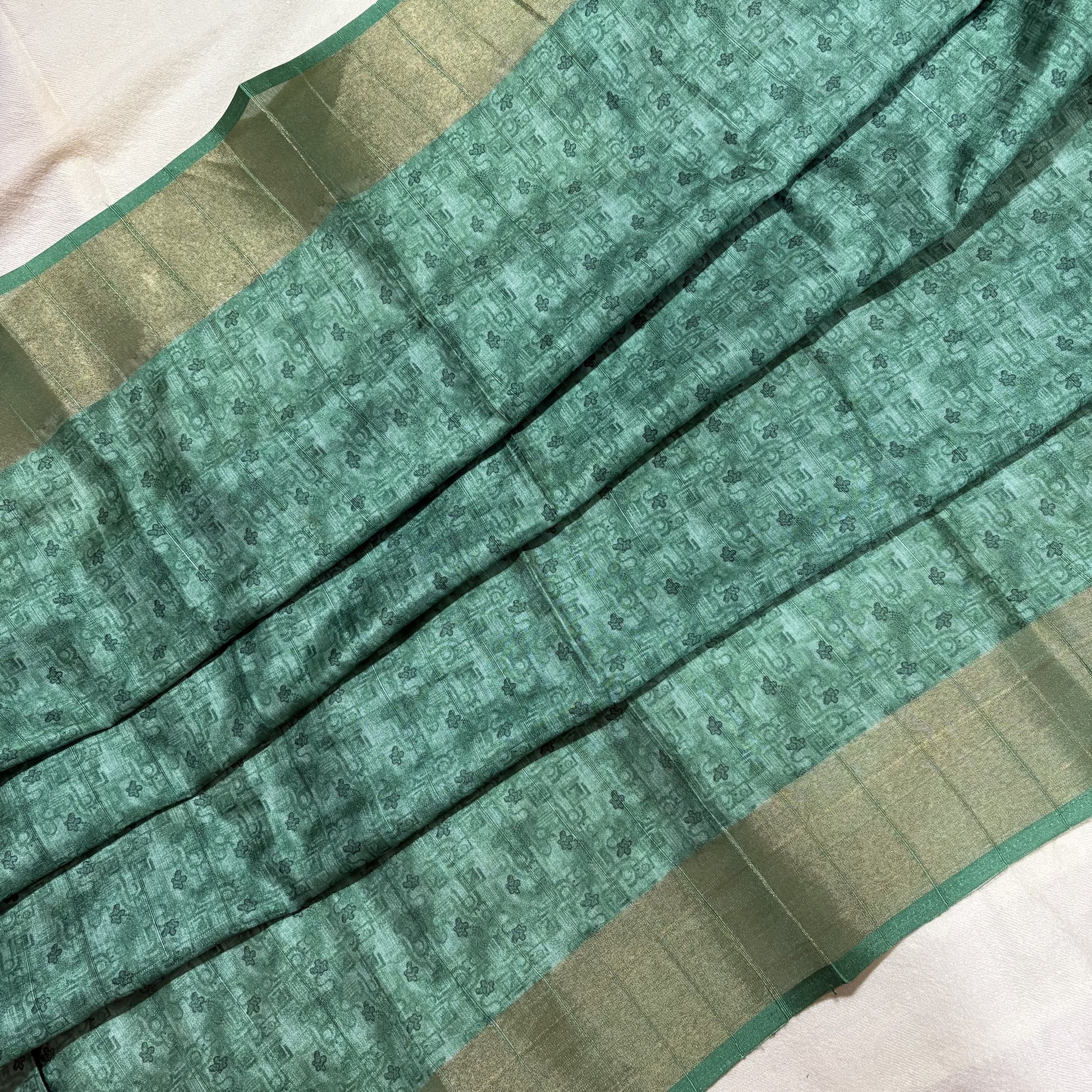 A beautiful Pink Semi Tussar Saree features elegant geometric prints all over with a charming floral border. The pallu stands out with detailed floral patterns. Light, flowy, and easy to carry — perfect for festive mornings or casual gatherings.