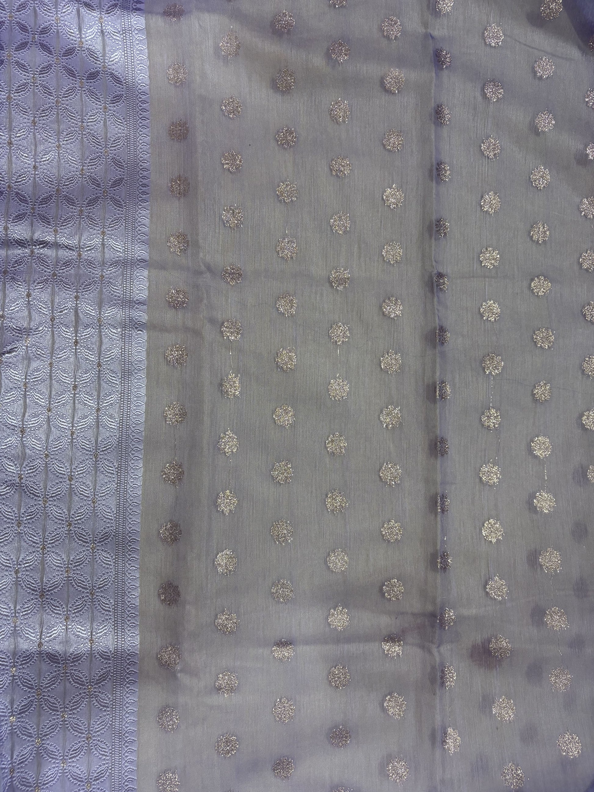 A stunning Lavender Soft Cotton Saree featuring unique woven patterns. The body of the saree has a beautiful textured weave with intricate floral and tree motifs. The pallu and borders are adorned with detailed, geometric designs, giving it a modern yet traditional look. The soft and lightweight fabric makes it an elegant and comfortable choice for casual outings, daytime events, or cultural gatherings.