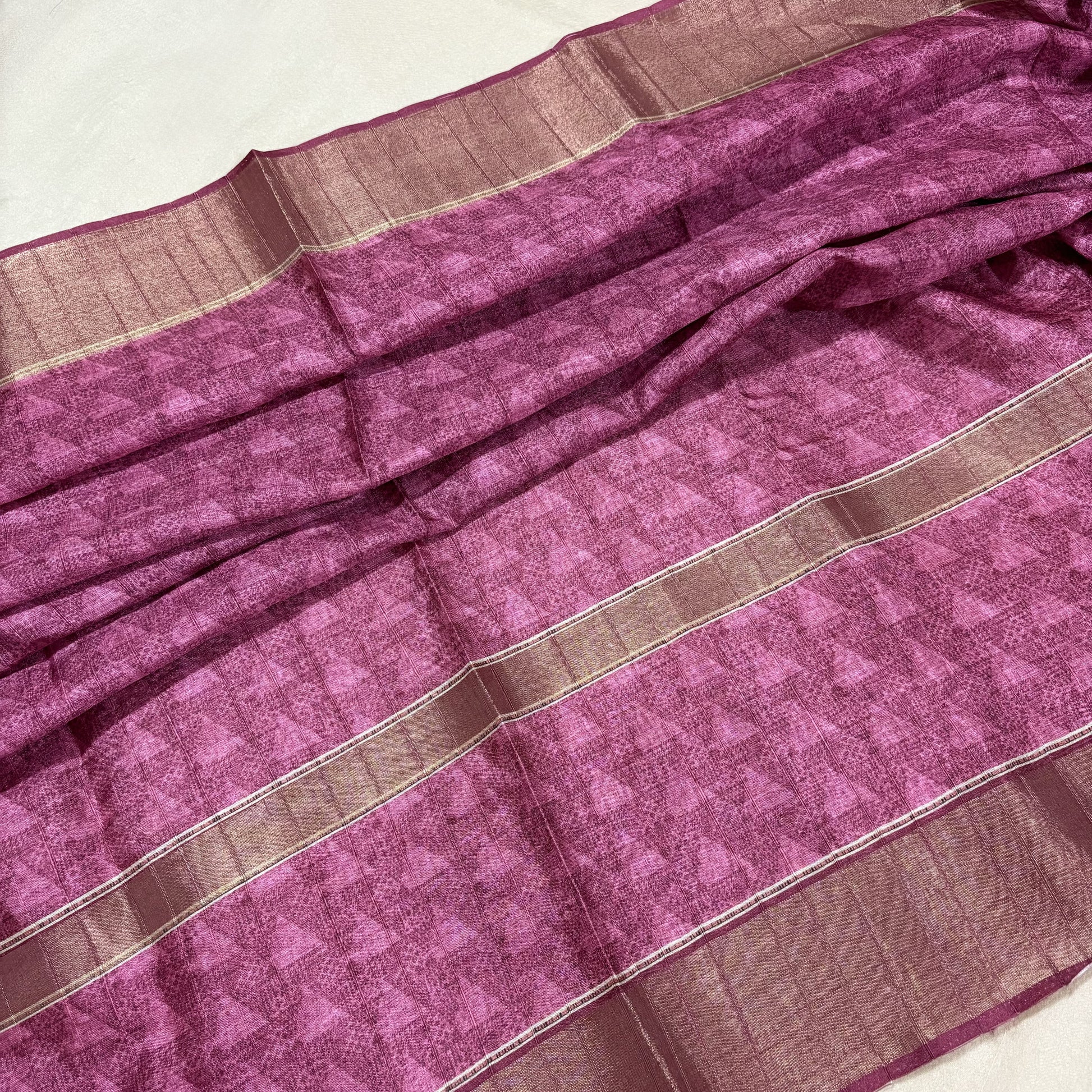 A beautiful Pink-Green Semi Tussar Saree features elegant geometric prints all over with a charming floral border. The pallu stands out with detailed floral patterns. Light, flowy, and easy to carry — perfect for festive mornings or casual gatherings.