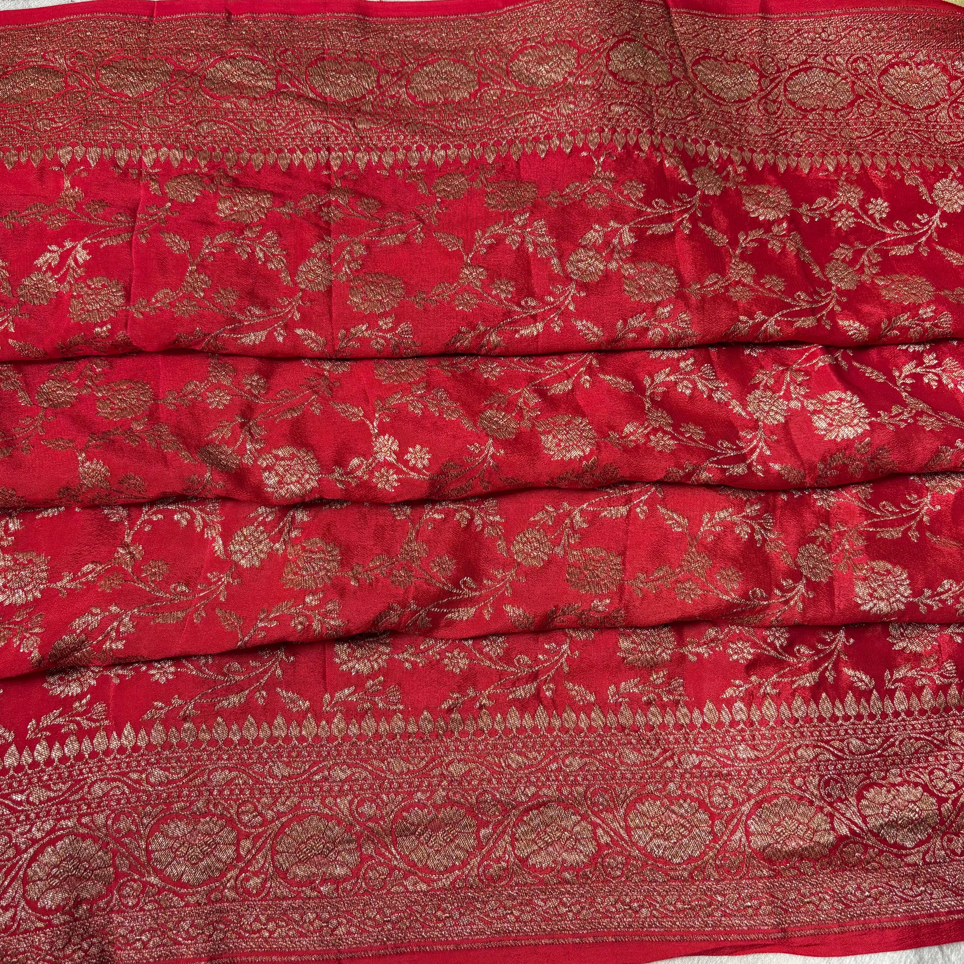- Design: Intricate antique gold zari buttas, rich floral border, pallu and blouse