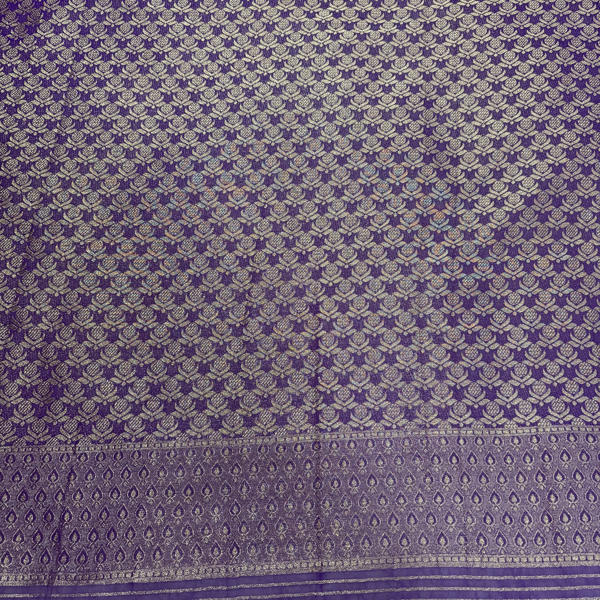 A rich traditional look purple saree with antique gold zari woven buttas all over. It comes with a detailed border and a grand pallu, making it perfect for festivals, or any special occasion.