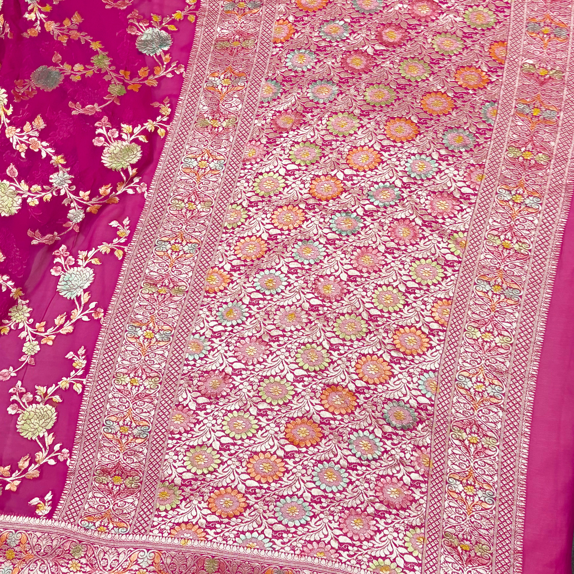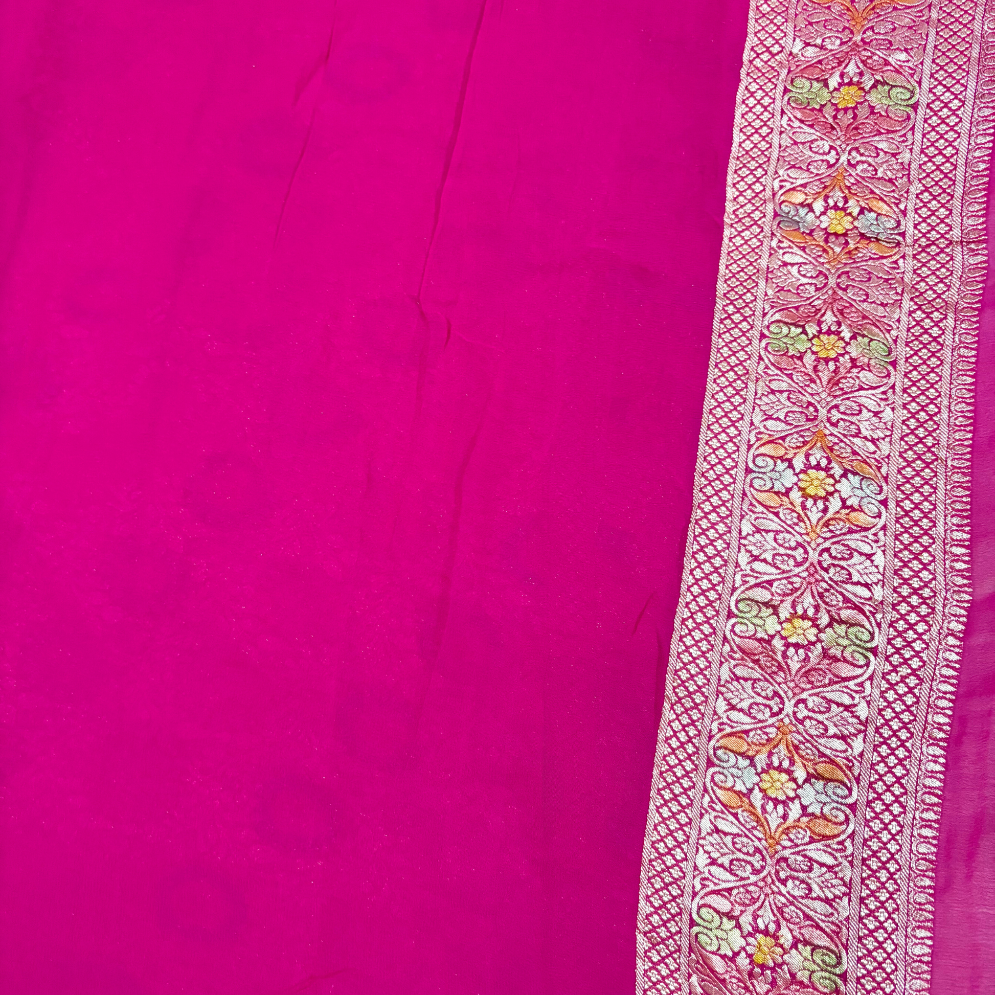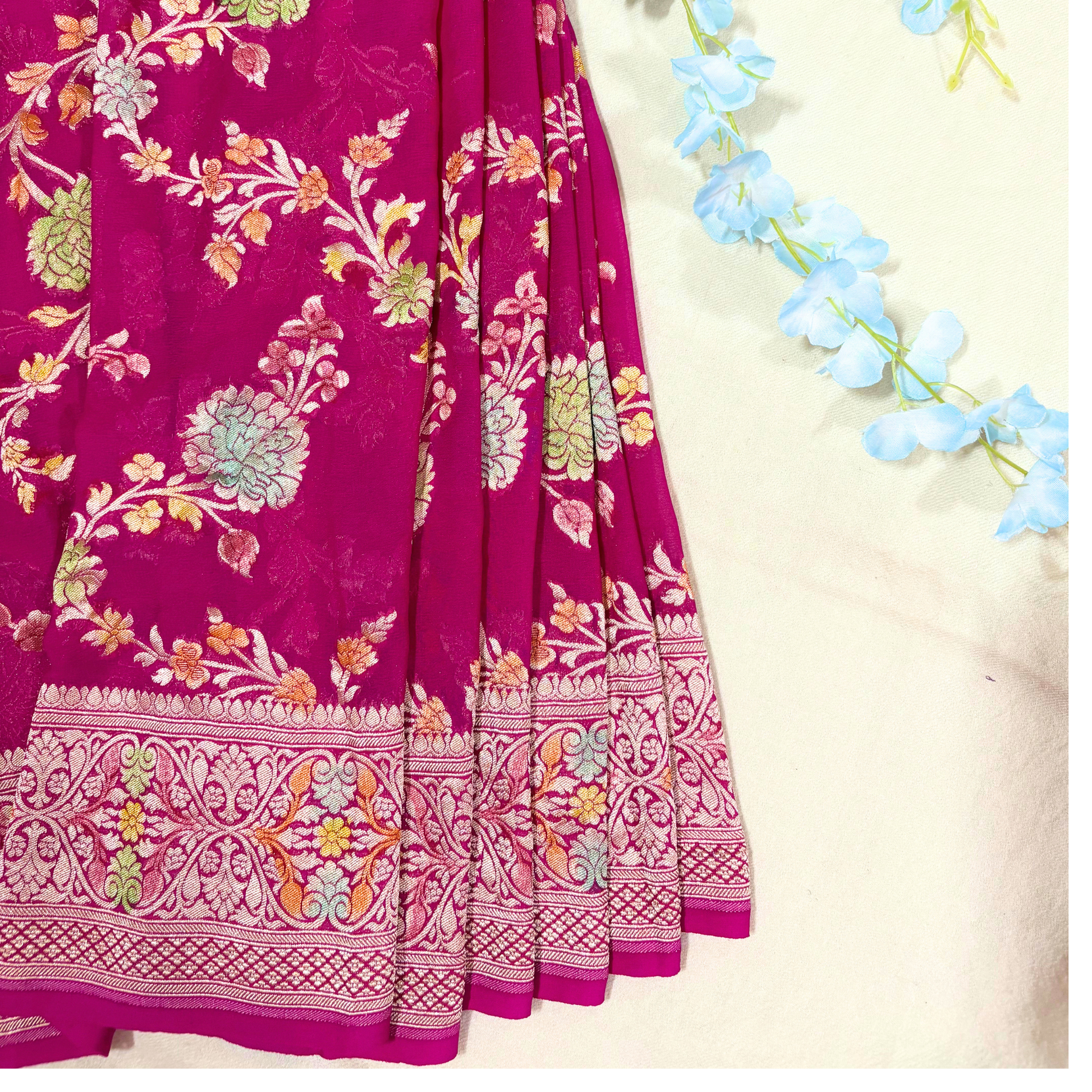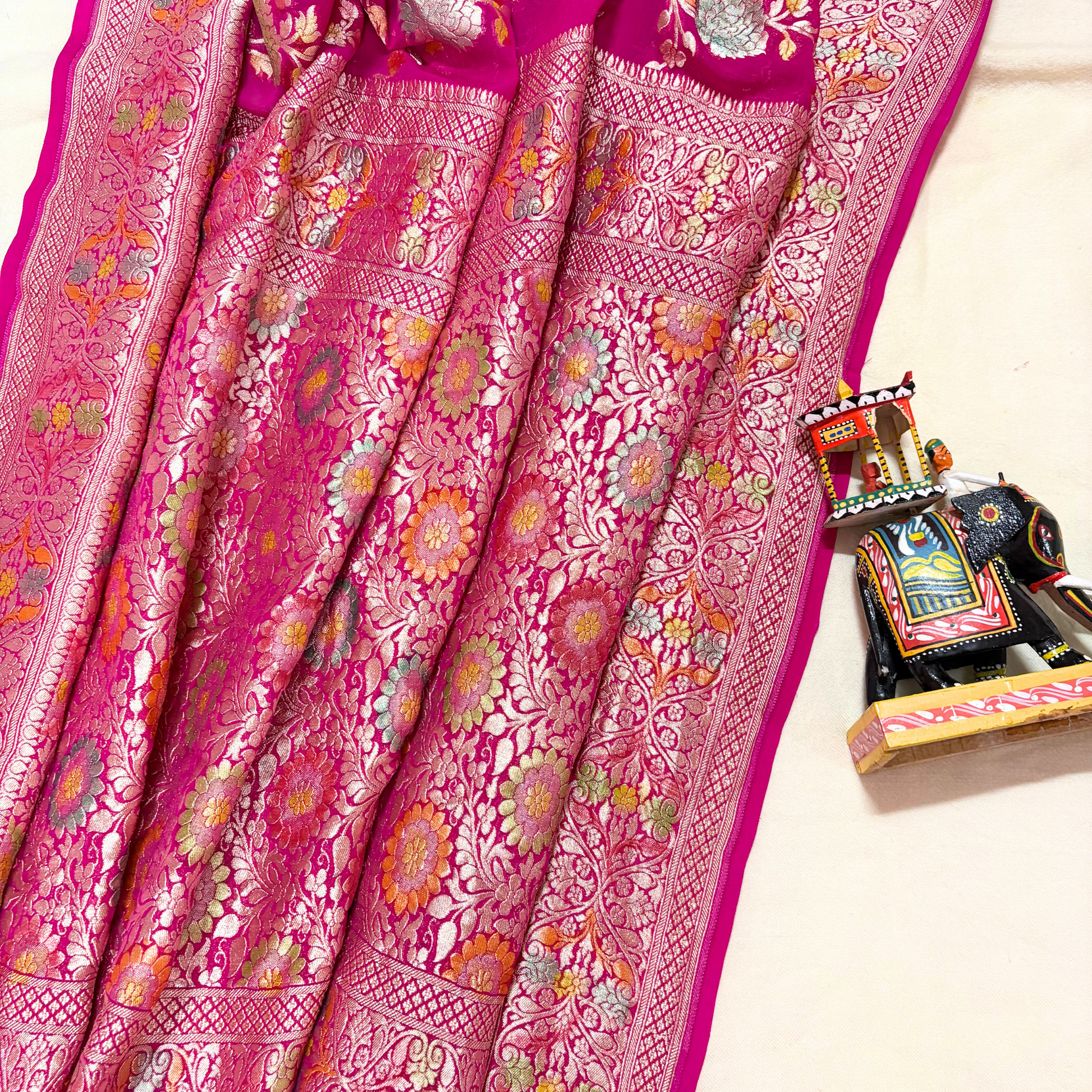 A stunning Pink Pure Khaddi Georgette Banarasi saree with intricate gold zari and meenakari floral weaving and a detailed zari border. Perfect for weddings, festivals, and family gatherings.