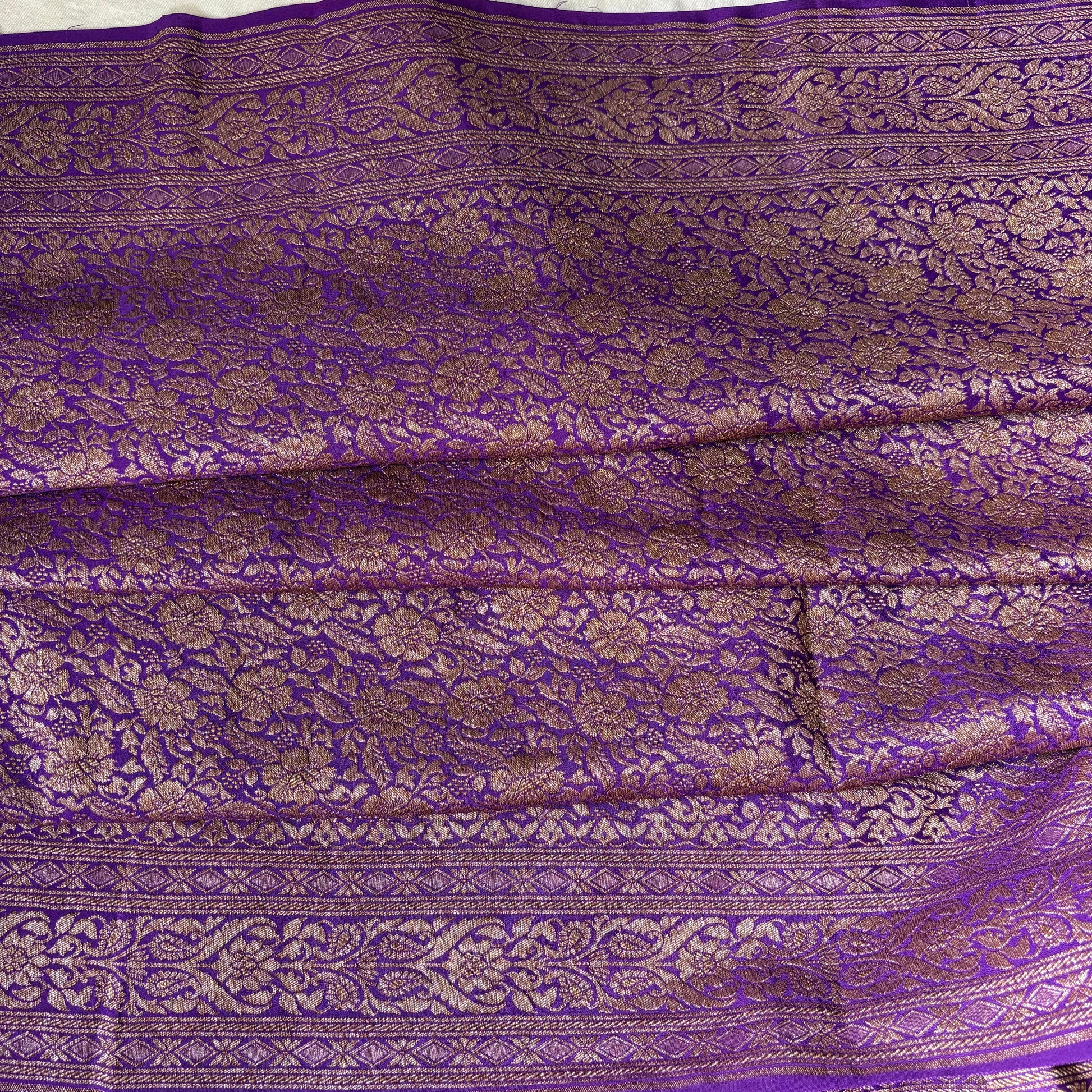 - Design: Intricate antique gold zari buttas, rich floral border, pallu and blouse
