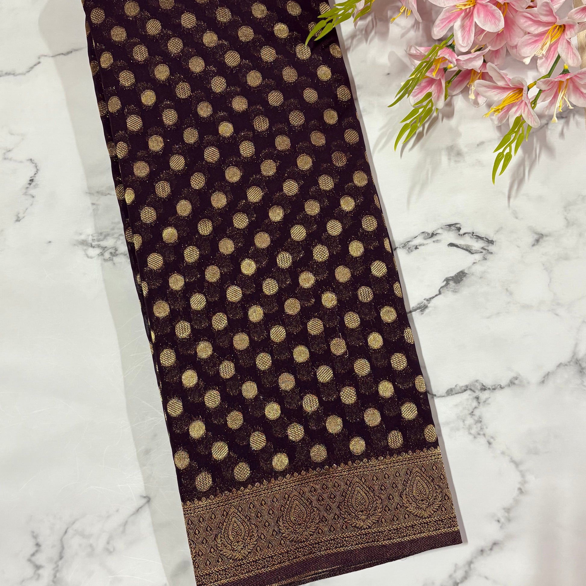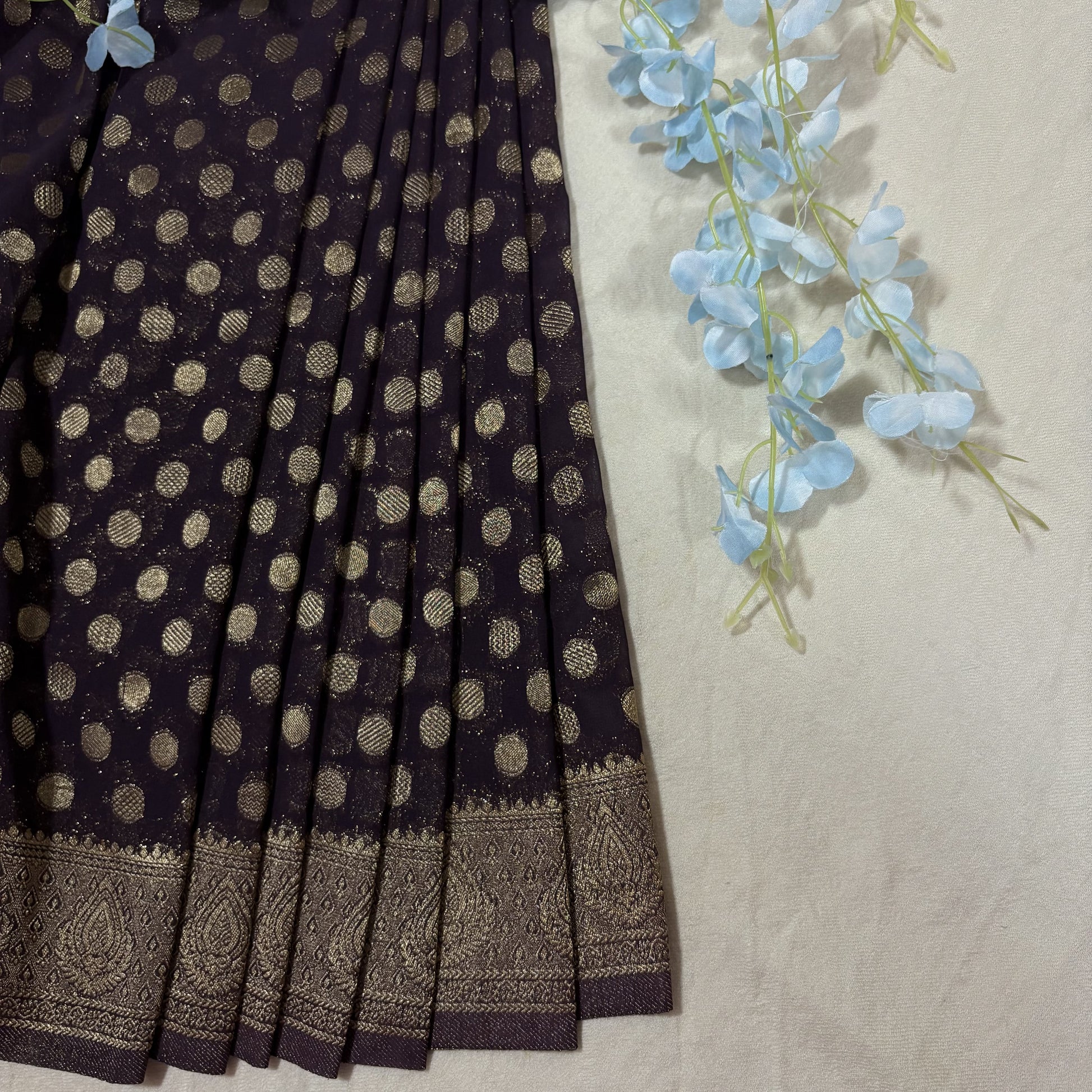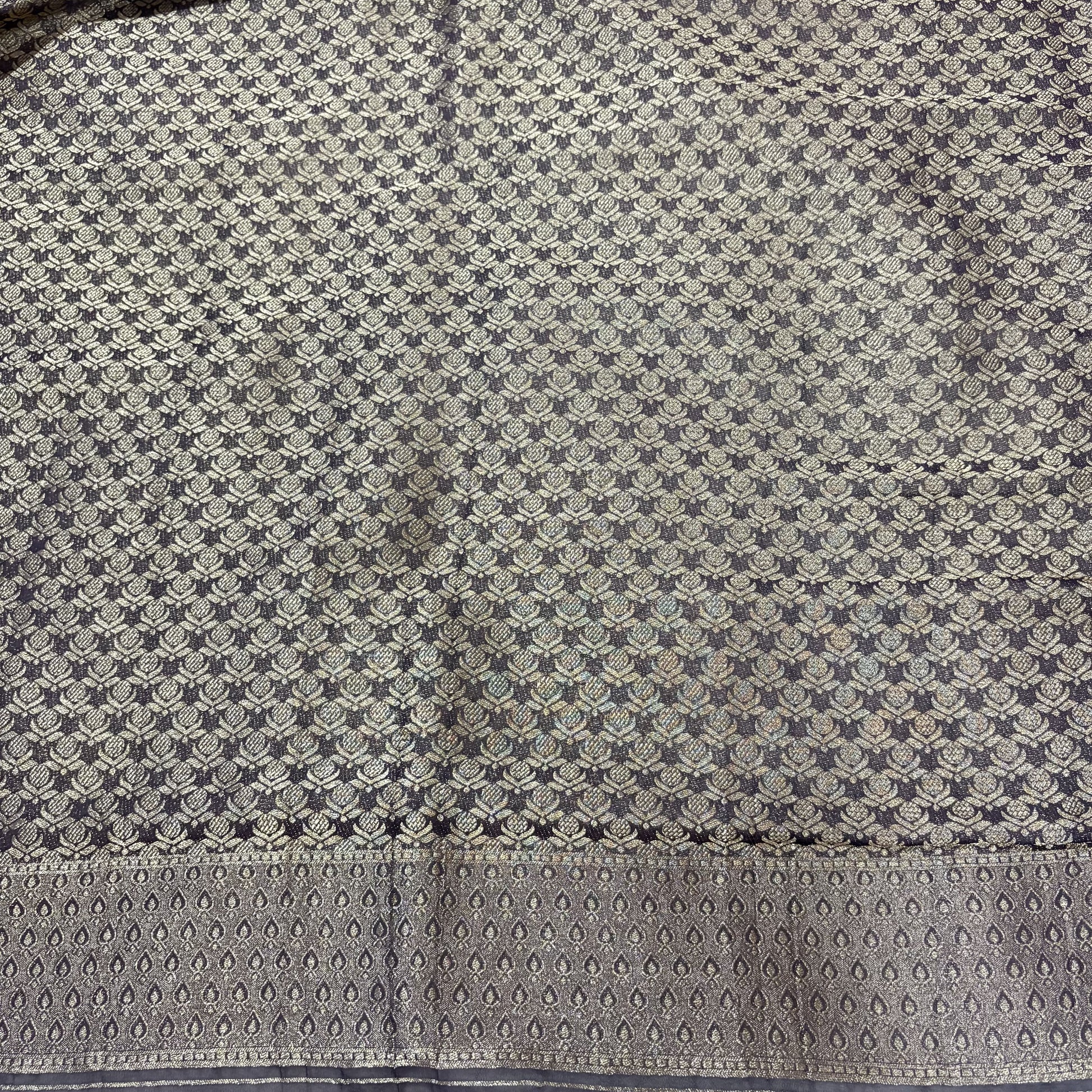 A rich traditional look snuff saree with antique gold zari woven buttas all over. It comes with a detailed border and a grand pallu, making it perfect for festivals, or any special occasion.