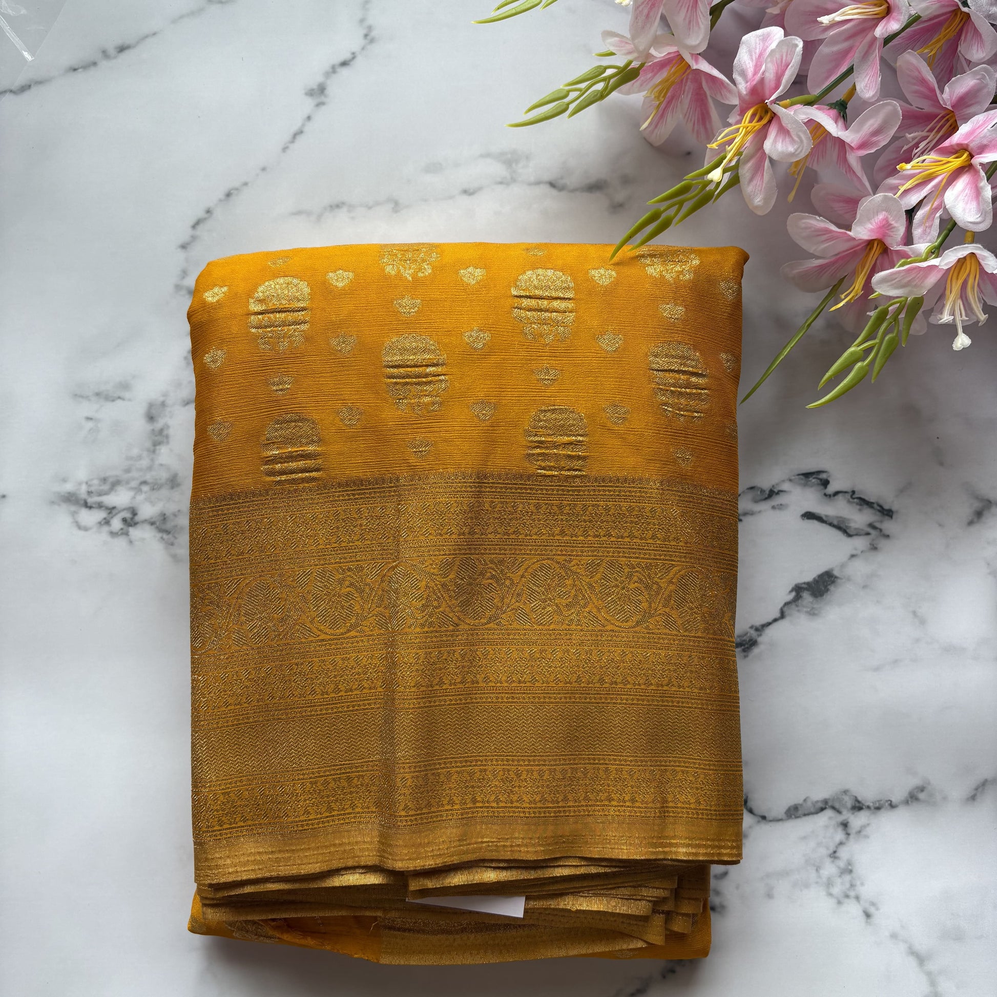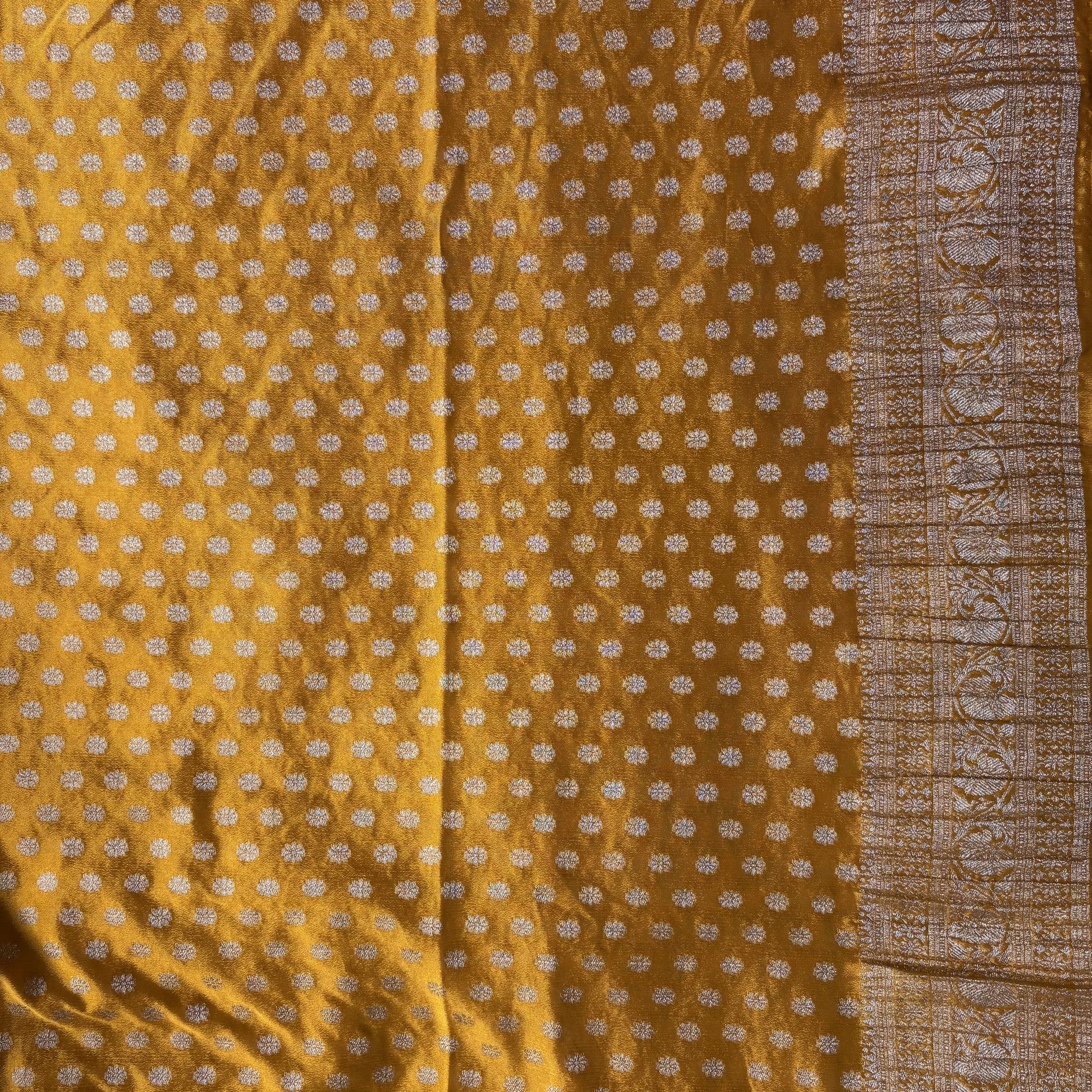 - Design: Antique gold zari buttas and intricate woven border & pallu
